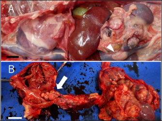 Fig. 3. Gross finding of the abdominal region. (A) A large tumor mass (arrowhead) locates in the cranial region of the left kidney. The mass attached to and invaded the left renal vein deeply and invades the lumen of vena cava. (B) The tumor tissue invades also the vena cava and grew upstream to the right ventricle. The whole surface and the cut section of the mass are white or dark red. Bars indicate 2 cm. DiscussionTo date, only a few cases of ECS-related pheochromocytoma have been reported in dogs (Galac et al., 2005; Lee et al., 2020; Arias et al., 2021). In one case, the left AT was surgically removed and the cortisol level returned to the normal range without any medication (Lee et al., 2020). In the present case, the ACTH stimulation tests revealed that the cortisol levels increased in an ACTH-dependent manner. This is a characteristic feature of Cushing’s syndrome. However, the abdominal mass was pheochromocytoma, not an adrenocortical tumor, and immunostaining was negative for the ACTH marker. In humans, it has been reported that there are cases of ectopic ACTH-producing tumors that are negative for anti-ACTH antibodies by immunostaining (Folkestad et al., 2014). Immunostaining with anti-CRH antibodies is used for CRH-producing tumors in humans, but it is difficult to distinguish between them in dogs because it is currently difficult to use. Thus, we considered that pheochromocytoma was the cause of ECS in this case. In addition, transient tumor regression was observed by treatment with mitotane, a drug effective for ACTH-producing tumors (Waszut et al., 2017). Thus, we suspected that the pheochromocytoma was ACTH-producing and caused ECS. By treatment with mitotane, the cortisol level decreased significantly and the size of the left adrenal mass was reduced. This suggests that mitotane exerts some effects on ectopic ACTH-producing tumor cells. The dog survived for 280 days after the tumor diagnosis. This survival period was significantly longer than those reported in other cases of typical pheochromocytoma with the invasion of the caudal vena cava (Barthez et al., 1997; Barrera et al., 2013; Musser et al., 2018). We consider this prolonged survival period was also attributed to mitotane treatment. To our knowledge, this is the first case report which describes the use and effectivity of mitotane in ECS-related pheochromocytoma. The findings of this case suggest that mitotane treatment enables long-term survival in dogs with ECS-related pheochromocytomas, which are quite hard to treat surgically. However, there is a case that a combination of cortical and medullary ATs may be simultaneously present (Appelgrein et al., 2020). We consider a possibility that adrenocortical tumor and pheochromocytoma coexisted, and only the cortical tumor reduced in size due to mitotane, leaving only the pheochromocytoma.