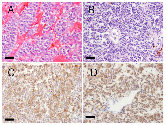 Fig. 4. Histopathological findings of the tumor tissue. (A and B) Hematoxylin and eosin stain. The mass comprises variously shaped tumor cells. The cells are polyhedral with large eosinophilic cytoplasm or are spindle-shaped with scant cytoplasm. The polyhedral cells are arranged in nests or chords and are separated by fine septa or capillary collagen. The spindle cells are scattered and form pseudorosettes in some regions. (C and D) Anti-chromogranin A immunohistochemistry. Both types of tumor cells are positive for chromogranin A, a marker of neuroendocrine cells (detected in brown). Bars indicate 50 μm. In addition, based on the references and the owner's intentions, the patient was treated with mitotane, but we should think about whether there were differences in tumor response with the dose or with another medicine, such as trilostane. More information is needed to confirm the effect of mitotane against ECS-related tumors including pheochromocytoma. Conflict of interestThe authors declare that there is no conflict of interest. AcknowledgmentsWe express our sincere thanks to the owner of the dog for donating her canine patient’s remains for our pathological examination. ReferencesAppelgrein, C., Hosgood, G., Drynan, E. and Nesbitt, A. 2020. Short-term outcome of adrenalectomy in dogs with adrenal glamd tumours that did not receive pre-operative medical management. Aust. Vet. J. 98(9), 449–454. Barrera, J.S., Bernard, F., Ehrhart, E.J., Withrow, S.J. and Monet, E. 2013. Evaluation of risk factors for outcome associated with adrenal gland tumors with or without invasion of caudal vena cava and treated via adrenalectomy in dogs:86 cases (1993-2009). J. Am. Vet. Med. Assoc. 15, 1715–1721. Barthez, P.Y., Marks, S.L., Woo, J., Feldman, E.C. and Matteucci, M. 1997. Pheochromocytoma in dogs: 61 cases (1984-1995). J. Vet. Intern. Med. 11, 272–278. Arias, E.A.S., Castillo, V.A., Louiset, E. and Lefebvre, H. 2021. Cushing's syndrome caused by intra-adrenocortical adrenocorticotropic hormone in a dog. J. Vet. Intern. Med. 36, 264-271. Folkestad, L., Andersen, M.S., Nielsen, A.L. and Glintborg, D. 2014. A rare cause of Cushing’s syndrome: an ACTH-secreting phaeochromocytoma. BMJ Case Rep. 2014, bcr2014205487. Gabi, J.N., Milhem, M.M., Tover, Y.E., Karem, E.S., Gabi, A.Y. and Khthir, R.A. 2018. Severe Cushing syndrome due to an ACTH-producing pheochromocytoma: a case presentation and review of the literature. J. Endocr. Soc. 2, 621–630. Galac, S., Kooistra, H.S., Voorhout, G., Van, Den, Ingh, T.S., Mol, J.A., Van, den, Berg, G. and Meji, B.P. 2005. Hyperadrenocorticism in a dog due to ectopic secretion of adrenocoticotropic hormone. Domest. Anim. Endocrinol. 28, 338–348. Iwasaki, T., Tsujimoto, H. and Hasegawa, A. 2011. Textbook of veterinary internal medicine. Tokyo, Japan: Buneidou. Lee, S., Lee, A., Chai, S.H., Lee, S., Kweon, O.K. and Kim, W.H. 2020. Ectopic Cushing’s syndrome associated with a pheochromocytoma in a dog: a case report. BMC Vet. Res. 16, 35. Musser, M.L., Taikowski, K.L., Johannes, C.M. and Bergman, P.J. 2018. Retrospective evaluation of toceranib phosphate (Palladia®) use in the treatment of inoperable, metastatic, or recurrent canine pheochromocytomas: 5 dogs (2014–2017). BMC Vet. Res. 14, 272. Nelson, R.W. and Couto, C.G. 2011. Small animal internal medicine, 4th ed. Tokyo, Japan: Interzoo Publishing Co., Ltd. Shindou, T., Masumori, N., Tanaka, T., Kitamura, H., Takahashi, S., Sunaga, D., Tsuchihashi, K. and Tsukamoto, Y. 2012. A case of ACTH-producing pheochromocytoma treated by laparoscopic adrenalectomy. Jpn. J. Endourol. 25, 337–340. Tsujimoto, H., Koyama, S., Okusa, K. and Kaneshima, T. 2015. A guidebook of medical treatments for sick cats and dogs 2015: my methods. Tokyo, Japan: Interzoo Publishing Co., Ltd. Waszut, U., Szyszka, P. and Dworakowska, D. 2017. Understanding mitotane mode of action. J. Physiol. Pharmacol. 68, 13–26. White, A., Ray, D.W., Talbot, A., Abraham, P., Thody, A.J. and Bevan, J.S. 2000. Cushing’s syndrome due to phaeochromocytoma secreting the precursors of adrenocorticotropin. J. Clin. Endocrinol. Metab. 85, 4771–4775. | ||