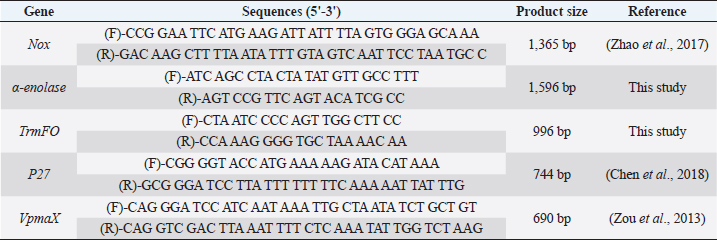 AbstractBackground: Mycoplasma bovis causes various diseases such as bronchopneumonia, otitis media, arthritis, and mastitis in cattle. Mycoplasma bovis is often isolated from the deep pharynges of healthy cattle and is generally considered not to cause clinical symptoms while in the upper respiratory tract. In mycoplasma infections, adhesion to the host cells is a crucial step. In recent years, five new adhesins, NOX, α-enolase, TrmFO, P27, and VpmaX, have been reported in M. bovis strains from pneumonia cases. However, the presence of these adhesins in wild isolates has not been established. Aim: This study aimed to investigate the presence of these adhesin genes in wild isolates isolated from cattle nasal cavities and lesion sites (pneumonia, otitis media, arthritis, and mastitis) in various regions in Japan and clarify the relationship between adhesion and the symptoms caused by M. bovis infection. Methods: A total of 141 M. bovis wild isolates isolated from nasal cavities (healthy or sick cattle), lungs with pneumonia, ears with otitis media, joint fluids of arthritic animals, and milk of mastitic animals. Mycoplasma bovis type strain PG45 was also used. Specific polymerase chain reaction reactions were performed to detect nox, α-enolase, trmFO, P27, and vpmaX, which are adhesins of M. bovis. Results: This study reports 139 M. bovis wild isolates were positive for nox, α-enolase, trmFO, P27, and vpmaX, while two isolates each lacked α-enolase or P27 genes. Mycoplasma bovis PG45 also had all five adherens genes. Conclusion: Almost all M. bovis wild isolates possessed all nox, α-enolase, trmFO, P27, and vpmaX genes regardless of the lesion site or region of origin. This means no relationship was found between the presence of the five adhesins and lesion sites in M. bovis and M. bovis isolated from the nasal cavities of asymptomatic cattle have the same numbers and types of adhesins as isolates from symptomatic lesion sites (pneumonia, otitis media, arthritis, and mastitis). This suggests that not only M. bovis isolates from pulmonary lesions, but also M. bovis existing in the nasal cavity has the potential to causes symptoms in the host. Keywords: Adhesin, Cattle, Mycoplasma bovis. IntroductionMycoplasma bovis belongs to the Mollicutes and lacks a cell wall, and it can cause bronchopneumonia, otitis media, arthritis, and mastitis in cattle (Bürki et al., 2015). However, M. bovis is often isolated from the deep pharynges of healthy cattle (Lima et al., 2016) and is generally considered not to cause clinical symptoms while in the upper respiratory tract (Hananeh et al., 2018). When M. bovis reaches the lung airways though it causes pneumonia. Otitis media is caused following pneumonia and arthritis, and pneumonia or mastitis is often observed during arthritis onset (Maunsell et al., 2011). Clinical signs of arthritis and pneumonia are often present at the same time (Caswell and Archambault, 2007). Mycoplasma bovis antigen has also been detected in the liver and kidney by immunohistochemistry (Maeda et al., 2003). In addition, it was reported that M. bovis is involved in bovine endocarditis (Kanda et al., 2019). These studies strongly suggest that M. bovis can hematogenously spread to the several organs and tissues and cause lesions at various sites. One of the first steps in mycoplasma infection is adhesion to host cells (Bürki et al., 2015). Adhesins expressed on the cell membrane of M. bovis, which lacks a cell wall, are very important factors for the microorganism. P26 and variable surface lipoproteins (Vsps) are well known as typical M. bovis adhesins (Sachse et al, 2000; Bürki et al., 2015). In recent years, with progress in M. bovis genomics, NOX, α-enolase, TrmFO, P27, and VpmaX have been reported as M. bovis adhesins in strains Hubei-1 and HB0801 (Song et al., 2012; Zou et al., 2013; Guo et al, 2017; Zhao et al., 2017; Chen et al, 2018). NOX, α-enolase, TrmFO, and P27 are fibronectin- or plasminogen-binding proteins (Song et al., 2012; Guo et al, 2017; Zhao et al., 2017; Chen et al, 2018), and VpmaX is a lipoprotein expressed on the cell membrane (Zou et al., 2013). Unlike Hubei-1 and HB0801 strains, which were isolated from pneumonia cases (Li et al., 2011; Qi et al., 2012), it is unknown whether isolates isolated from other lesion sites such as those of otitis media, arthritis, and mastitis possess these adhesins. In addition, the number of isolates whose genomes have been analyzed is very few, and the presence of these adhesins in wild isolates has not been established. Therefore, we investigated the presence of NOX, α-enolase, TrmFO, P27, and VpmaX genes by polymerase chain reaction (PCR) in wild M. bovis isolates from various lesion sites in various regions of Japan. This will clarify the relationship between adhesion and the symptoms caused by M. bovis infection and help elucidate its pathology. Materials and MethodsSample used in this studyA total of 141 M. bovis wild isolates from 134 cattle in 10 prefectures in Japan from 2008 to 2013 were used in this study. The number of isolates from nasal cavities (healthy or sick cattle), lungs with pneumonia, ears with otitis media, joint fluids of arthritic animals, and milk of mastitic animals was 86, 35, 6, 3, and 11, respectively. To confirm the identity of the isolates, PCR with specific primers for the OppD/F gene (Hotzel et al., 1996) or loop-mediated isothermal amplification (Higa et al., 2016) of M. bovis were performed. Mycoplasma bovis type strain PG45 was also used, and all isolates were stored at −80°C until use. DNA of each isolate was extracted by the hot-shot method after incubation for 4 or 5 days at 37 °C in NK broth (Kanto Chemistry, Tokyo, Japan) and stored at −20°C until use. PCR to detect adhesinsSpecific PCR reactions were performed to detect nox, α-enolase, trmFO, P27, and vpmaX, which are adhesins of M. bovis. Primers for α-enolase and trmFO were designed according to the conserved sequ