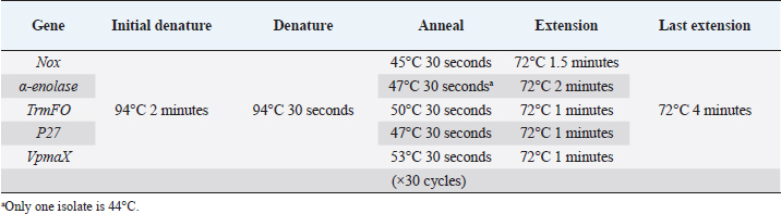 In this study, no relationship was found between the presence of the five adhesins and lesion sites in M. bovis. However, this means that M. bovis isolated from the nasal cavities of asymptomatic cattle have the same numbers and types of adhesins as isolates from symptomatic lesion sites (pneumonia, otitis media, arthritis, and mastitis). Mycoplasma bovis has also been isolated from the deep pharynges of healthy cows (Lima et al., 2016), and it may not cause clinical symptoms as long as it is in the upper respiratory tract (Hananeh et al., 2018). However, it is thought that suppression of the host immune system caused by stress or viral infection results in the rapid growth of pathogenic bacteria in the upper respiratory tract and reduced clearance in the lower respiratory tract, and these pathogenic bacteria reach the lungs (Griffin et al., 2010). After reaching the lung airways, this microorganism causes pneumonia, spreads throughout the body via the bloodstream, and causes various symptoms in infected hosts. This suggests that even M. bovis existing in the nasal cavity of healthy cows may colonize various tissues and result in lesions. The period during which M. bovis exists in the bloodstream in the host is short (Caswell and Archambault, 2007). Nevertheless, during this time, it spreads to various tissues and causes myriad symptoms. This may be due to the abundance of adhesins as shown in this study. In conclusion, we found that M. bovis wild isolates in Japan universally possess nox, α-enolase, trmFO, P27, and vpmaX. The presence of this variety of adhesins may be involved in the pathogenicity and pathology of M. bovis. AcknowledgmentsThe authors would like to thank Drs. Higuchi and Gondaira of Rakuno Gakuen University who provided some M. bovis wild isolates. Conflict of interestThe authors declare that there is no conflict of interest. Author contributionsConceptualization, F. Shitamori, T. Kanda, and R. Uemura; methodology, F. Shitamori and T. Kanda; validation, F. Shitamori and R. Uemura; investigation, F. Shitamori and T. Kanda; resources, R. Uemura; writing—original draft preparation, F. Shitamori; writing—review and editing, F. Shitamori, R. Uemura and M. Sueyoshi; supervision, R. Uemura and M. Sueyoshi; project administration, R. Uemura; funding acquisition, R. Uemura. All authors have read and agreed to the published version of the manuscript. ReferencesBergmann, S., Wild, D., Diekmann, O., Frank, R., Bracht, D., Chhatwal, G.S. and Hammerschmidt, S. 2003. Identification of a novel plasmin (ogen)-binding motif in surface displayed α-enolase of Streptococcus pneumoniae. Mol. Microbiol. 49, 411–423. Bürki, S., Frey, J. and Pilo, P. 2015. Virulence, persistence and dissemination of Mycoplasma bovis. Vet. Microbiol. 179, 15–22. Caswell, J. L. and Archambault, M. 2007. Mycoplasma bovis pneumonia in cattle. Anim. Health Res. Rev. 8, 161–186. Chen, X., Huang, J., Zhu, H., Guo, Y., Khan, F.A., Menghwar, H., Zhao, G. and Guo, A. 2018. P27 (MBOV_RS03440) is a novel fibronectin binding adhesin of Mycoplasma bovis. Int. J. Med. Microbiol. 308, 848–857. Griffin, D., Chengappa, M.M., Kuszak, J. and McVey, D.S. 2010. Bacterial pathogens of the bovine respiratory disease complex. Vet Clin North Am Food Anim Pract. 26, 381–394. Guo, Y., Zhu, H., Wang, J., Huang, J., Khan, F.A., Zhang, J., Guo, A. and Chen, X. 2017. TrmFO, a fibronectin-binding adhesin of Mycoplasma bovis. Int. J. Mol. Sci. 18, 1732. Hananeh, W.M., Momani, W., Ababneh, M.M. and Abutarbush, S.M. 2018. Mycoplasma bovis arthritis and pneumonia in calves in Jordan: An emerging disease. Vet. World. 11, 1663–1668. Higa, Y., Uemura, R., Yamazaki, W., Goto, S., Goto, Y. and Sueyoshi, M. 2016. An improved loop-mediated isothermal amplification assay for the detection of Mycoplasma bovis. J Vet. Med. Sci. 78, 1343–1346. Hotzel, H., Saches, K. and Pfutzner, H. 1996. Rapid detection of Mycoplasma bovis in milk samples and nasal swabs using the polymerase chain reaction. J. Appl. Bacteriol. 80, 505–510. Jones, M.N. and Holt, R.G. 2007. Cloning and characterization of an α-enolase of the oral pathogen Streptococcus mutans that binds human plasminogen. Biochem. Biophys. Res. Commun. 364, 924–929. Kanda, T., Tanaka, S., Suwanruengsri, M., Sukmawinata, E., Uemura, R., Yamaguchi, R. and Sueyoshi, M. 2019. Bovine endocarditis associated with Mycoplasma bovis. J. Comp. Pathol. 171, 53–58. Li, Y., Zheng, H., Liu, Y., Jiang, Y., Xin, J., Chen, W. and Song, Z. 2011. The complete genome sequence of Mycoplasma bovis strain Hubei-1. PLoS One 6, e20999. Lima, S.F., Teixeira, A.G., Higgins, C.H., Lima, F.S. and Bicalho, R.C. 2016. The upper respiratory tract microbiome and its potential role in bovine respiratory disease and otitis media. Sci. Rep. 6, 29050. Maeda, T., Shibahara, T., Kimura, K., Wada, Y., Sato, K., Imada, Y., Ishikawa, Y. and Kadota, K. 2003. Mycoplasma bovis-associated suppurative otitis media and pneumonia in bull calves. J. Comp. Pathol. 129, 100–110. Maunsell, F.P., Woolums, A.R., Francoz, D., Rosenbusch, R.F., Step, D.L., Wilson, D.J. and Janzen, E.D. 2011. Mycoplasma bovis infections in cattle. J. Vet. Intern. Med. 25, 772–783. Qi, J., Guo, A., Cui, P., Chen, Y., Mustafa, R., Ba, X., Hu, C., Bai, Z., Chen, X., Shi, L. and Chen, H. 2012. Comparative geno-plasticity analysis of Mycoplasma bovis HB0801 (Chinese isolate). PLoS One 7, e38239. Sachse, K., Helbig, J.H., Lysnyansky, I., Grajetzki, C., Müller, W., Jacobs, E. and Yogev, D. 2000. Epitope mapping of immunogenic and adhesive structures in repetitive domains of Mycoplasma bovis variable surface lipoproteins. Infect. Immun. 68, 680–687. Song, Z., Li, Y., Liu, Y., Xin, J., Zou, X. and Sun, W. 2012. α-enolase, an adhesion-related factor of Mycoplasma bovis. PLoS One 7, e38836. Wise, K.S., Calcutt, M.J., Foecking, M.F., Röske, K., Madupu, R. and Methé, B.A. 2011. Complete genome sequence of Mycoplasma bovis type strain PG45 (ATCC 25523). Infec
