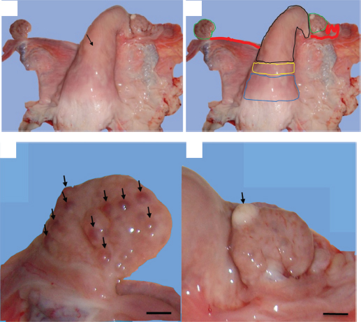 Fig. 1. Gross morphological aspect of female camel genital tract with unilateral uterine aplasia. (a) Lack of the left uterine horn and direct insertion of the left oviduct on the bifurcation of the uterine horns (arrow). (b) Genital organs; colored lines – blue: the cervix, yellow: uterine body, black: right uterine horn, red: oviducts, and green: ovaries. (c) Left ovary with small follicular structures (arrows). (d) Right ovary with atretic corpus luteum (arrow). (Scale bar: 1 cm). Endometrial gland dysgenesis and uterine infectionThe second uterine abnormality was the uterine gland dysgenesis associated to acute uterine infection. It was recorded in 4½-year-old nulliparous female camel weighing approximately 300 kg. The anamnesis stated that the she-camel reached the pubertal age at 3 years old and showed normal pattern of signs but reformed after two breeding seasons distinguished by repeat breeding syndrome. The slaughter period of the animal corresponded to the breeding season. The general examination showed that the female camel had a normal health conditions and BCI rating of 3 out of 5. The cervix and uterine horns had normal size and pelvic position. The uterine lumen contained serous exudate which was stained with blood. The uterus was hyperemic and edematous (Fig. 3). Both the ovaries had normal morphology and were symmetrical in size. Each ovary was found with one corpus luteum and without any follicular structures (Fig. 3). The uterine section showed sever dysgenesis of the endometrial glands, high infiltration by inflammatory cells, and proliferation and activation of endometrial stroma (Fig. 4). Focal vascular congestion was also observed on the endometrium (Fig. 4). The myometrium showed a focal infiltration by inflammatory cells (Fig. 4). DiscussionWe report, in this study, the first histopathological case with total agenesis of endometrial glands in female camels. A similar condition was communicated in riverine buffalo, ewes, bitch, and mare (Chethan et al., 2017; Dockweiler et al., 2017; Gray et al., 2002; Witkowski et al., 2017). It has been determined that this condition has genetic and/or hormonal backgrounds. Chromosomal aberrations, gene mutation or epigenetic strategies, both hormonal disturbances, and improper distribution of hormone receptors can result in incomplete adenogenesis or total UGKO (Chethan et al., 2017; Cooke et al., 2013; Emam, 2014; Gray et al., 2001a; Osman et al., 2018; Spencer et al., 2019).