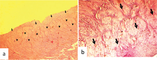 Fig. 2. Hematoxylin and eosin stained photographs of transversal sections of the remained uterus in female camel with unilateral uterine aplasia, showing a histopathologic aspect of the endometrium and the myometrium. (a) Endometrium with endometrial gland agenesis (arrows) and myometrium with hyalinization lesions (arrowheads) (100×). (b) Hyalinization of the myometrial layer (arrows) (400×).