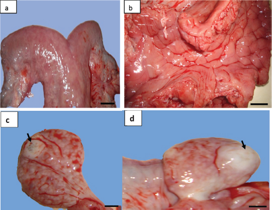 Fig. 3. (a) Gross morphology of genital tract and (b) the lumen of uterine horn of female camel with acute metritis. Both the (c) left and (d) right ovaries had normal morphology with atretic corpus luteum each one (arrows) (scale bar: 1 cm). The uterus unicornis had been described in different farm animal species. This abnormality is also called uterine agenesis or segmental aplasia of the uterus. In the dromedary camel and other mammalian species, the etiology of this pathology is unknown (Colaço et al., 2012; Gherissi et al., 2019; Oh et al., 2005). A pleiotropic gene effect in cows has been observed (Rendel, 1952). In this species, uterine agenesis is associated with the White Heifer Disease syndrome where the development defects of the Müllerian ducts (mesonephrotic) were noted (Hanzen, 2015b). Common associate feature, in this case, is often described as the imperforate hymen, absence of anterior part of the vagina, cervix or the uterine body, and developmental anomalies of the oviducts (Rendel, 1952). Literature analysis showed only one case of unicornuate uterus reported by Tibary et al. (2001) in a clinical study conducted over 9 years looking for reproductive disorders in the female camel (cited by Faye and Esenov, 2005). Moreover, some studies on a large number of female camels in Egypt (El-Wishy, 1989; Shawky et al., 2004), Nigeria (Ribadu et al., 1991), Algeria (Benaissa et al., 2015; 2017), Ethiopia (Melaku et al., 2015), Iraq (Wajid, 2015), and Saudi Arabia (Ali et al., 2015) have not recorded cases of this abnormality. This being so the frequency of the uterine horn aplasia in camels is as low as in cows, small ruminants, and new world camelids (Tibary and Anouassi, 1997). The rate of this abnormality was estimated between 0.12% and 0.45% in cows (Bos taurus) and buffalo (Bos bubalis) (Hatipoglu et al., 2002; Mimoune et al., 2016), 1.47% in goat (Beena et al., 2015), 1.3% in South American Camelids (Smith, 1985), and 0.05% in ewes (Smith et al., 1995). In ovine species, the uterus unicornis condition represents 1.8% of all developmental defects of paramesonephric ducts (Smith et al., 1995).