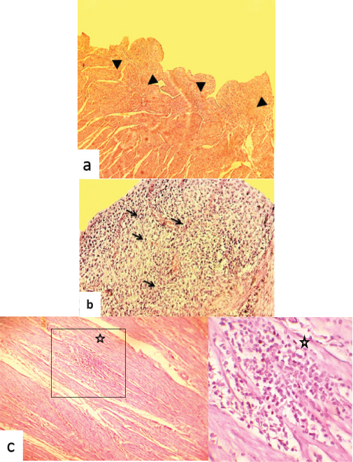 Fig. 4. Hematoxylin and eosin stained photographs of transversal sections of the uterine horn. (a) The endometrium showed dysgenesis of the endometrial glands (arrowheads) (40×). (b) Highly proliferated and activated stroma, and infiltration by inflammatory cells of the endometrium (arrows) (100×). (c) The myometrium showed focal infiltration by inflammatory cells (star) (100× and 400×). Similarly to the finding, the association between the uterine aplasia or aplastic segment of the uterus and lacked or attenuated endometrial glands in cats was reported by McIntyre et al. (2010). Thus, the endometrial components were not identified in histological evaluation of the abnormal horns and a fibrous mesenchymal tissue with some smooth muscle differentiation, and the blood vessels were present. Nevertheless, we did not note the association of the uterine agenesis with other congenital abnormalities of the genital tract segments in the studied female camel. This is not the case, particularly in the bovine species, where uterine agenesis could be associated with aplasia of other segments of the genital tract, namely, absence of the lumen of corpus uteri, cervix cyst, distension of the remained uterine horn, hydrosalpinx, narrow ductal vaginal appearance, blind sac on the level of cervix, and shorter corpus uteri (Hatipoglu et al., 2002). Likewise, associated lesions such as hydrometra of the remaining uterine horn, ovarian agenesis, and abnormal position of the contralateral ovary were reported in ovine species (Smith et al., 1995). We reported, in this study, the association of uterine gland dysgenesis and uterine infection. Similar degeneration of the glandular compartment of the endometrium was reported in female camels with acute endometritis (Benaissa et al., 2015). This would recall the uterine mucus secretions from the endometrial glands as chemical defense mechanism against contaminant microorganisms (Dhaliwal et al., 2001). Disruption of this mechanism allows opportunistic pathogens to colonize the endometrium and cause an endometritis particularly with wrong mating as suggested by Ali (2010) in a nulliparous female camel. The endometrial gland dysgenesis was also reported to be correlated to the ovarian follicular dynamic that is highly decreased during the nonbreeding season (Ali et al., 2017; Gherissi et al., 2018b). The bibliographic data lack information on the incidence of endometrial adenogenesis and regeneration anomalies on the reproduction flow of camels. The clinical behavior of repeat breeding was recorded during the harvest of commemoratives. Female camels were reformed because of unexplained infertility, and their genital tract abnormalities were passed unnoticed. The endometrial gland anomalies would be causing the impediment of gestation by alteration of uterine receptivity, blastocyst/conceptus survival and implantation, and stromal cell decidualization (Filant and Spencer, 2014; Gray et al., 2001b). The uterine aplasia in some mammal species as cat (Brookshire et al., 2017), cow (Moriyama et al., 2008), and mare (Gallacher and Gilbert, 2018) does not prevent pregnancy. In camelids, missing left uterine horn could lead to infertility as long as nearly all pregnancies occur in the left side (Ali et al., 2015; Gherissi et al., 2017; 2019; Tibary and Anouassi, 1997). Both cases of the genital anomalies had normal active ovaries. The anoestrus occurs if ovulation and corpus luteum are observed in the ipsilateral side of the missing horn (Hanzen, 2015b). Anyways, breeding of animals presenting such genital congenital affection is strongly discouraged because of the risk of genetic transmission of the abnormality (Tibary et al., 2001). The congenital agenesis of the endometrial glands was observed as a rare genital anomaly associated to unilateral uterine aplasia. The endometrial gland dysgenesis was recorded in association to acute uterine infection. These uterine anomalies would lead to definitive sterility. We suggested that the histopathologic complementary assessment can be a reliable technique since the clinical history and standard genital examinations almost do not orientate to assess these congenital abnormalities. Hormonal and/or genetic examinations are highly recommended to diagnose and eliminate such animals. Conflict of interestThe authors declare that there is no conflict of interest. Author’s contributionGherissi Djallel Eddine, Bouzebda Afri Farida, and Bouzebda Zoubir designed the study. Gherissi Djallel Eddine performed the experiments. Gherissi Djallel Eddine, Lamraoui Ramzi, and Faycel Chacha analyzed the data and wrote the paper. Christian Hanzen helped in writing the manuscript. ReferencesAli, A. 2010. Observations on the topography of the reproductive tract of the Arabian female camel. J. Agric. Vet. Sci. Qassim Univ. 3, 33–41. Ali, A., Derar, R., Al-Sobayil, F., Al-Hawas, F. and Hassanein, K. 2015. A retrospective study on clinical findings of 7300 cases (2007–2014) of barren female dromedaries. Theriogenology. 84, 452–456. Ali, H.M., Qureshi, A.S., Urbinati, G., Hussain, R., Mustafa, M.Z., Ali, F., Manan, A. and Massaad-Massade, L. 2017. Effects of natural environment on reproductive histo-morphometric dynamics of female dromedary camel. Anim. Reprod. 181, 30–40. Azawi, O.I. and Ali, A.J. 2011. A study on the prevalence of some pathological abnormalities of the uterus diagnosed at post mortem of buffaloes in Mosul. Buffalo Bull. 30(1), 67–71. Beena, V., Pawaiya, R.V.S., Shivasharanappa, N., Gururaj, K., Gupta, V.K., Gangwar, N.K., Singh, D.D., Karikalan, M., Sharma, A.K., Kumar, H., Kumar, A. and Singh, R. 2015. Occurrence of pathological conditions in the female genitalia of goats. Indian J. Vet. Pathol. 39(3), 197–201. Benaissa, M.H., Faye, B. and Kaidi, R. 2015. Reproductive abnormalities in female camel (Camelus dromedarius) in Algeria: relationship with age, season, breed and body condition score. J. Camel Pract. Res. 22(1), 67