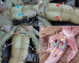 Fig. 1. The difference between male and female V. salvator based on the form of the ventral tail near the cloaca (A=female, B=male, 1=female no bulge, 2=male, there are bulges of hemipenis). Covered hemipenis (C): 3=cloaca, 4=hemipenis inside the tail’s base part. uncovered hemipenis (D): 3=cloaca, 4=hemipenis; 5=tendon.