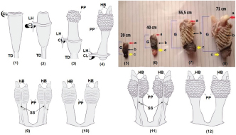 Fig. 2. Illustration of hemipenis eversion of mature V. salvator (1–4). CL: cloaca; HB=hemibaculum; LH=left hemipenis; PP=paryphasmata; TD=tendon. The macroscopic view of V. salvator hemipenis at each SVL: (5), (6), (7), and (8) were 39, 40, 55.5, 71 cm, respectively. a=hemibaculum, b=paryphasmata, c=corpus hemipenis, G=glans hemipenis. Illustration of hemipenis of immature (9–10) and mature (11–12) V. salvator. HB=hemibaculum; PP=paryphasmata; SS=sulcus spermaticus; 9 and 11=ventral side; 10 and 12=dorsal side.