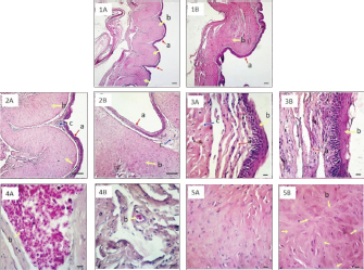 Fig. 3. Histology of paryphasmata of V. salvator with HE staining. Observation under 40× magnification (1A: SVL ≤ 40 cm; 1B: SVL > 40 cm): a=epidermis; b=dense connective tissue; bar: 100 μm. Observation under 100× magnification (2A: SVL ≤ 40 cm; 2B: SVL > 40 cm): a=epidermis; b=dense connective tissue; c=loose connective tissue; bar: 100 μm; Observation under 400× magnification (3A: SVL ≤ 40 cm; 3B: SVL > 40 cm): a=epidermis; b=loose connective tissue becomes thicker on SVL > 40 cm; c=dense connective tissue; bar: 10 μm. Loose connective tissue under 400× magnification (4A: SVL ≤ 40 cm; 4B: SVL > 40 cm): b=erythrocyte; bar: 10 μm. Dense connective tissue under 400× magnification (5A: SVL ≤ 40 cm; 5B: SVL > 40 cm): b=collagen fibers; bar: 10 μm.