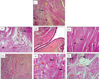 Fig. 4. Histology of V. salvator hemibaculum with HE staining (1). a=collagen; b=hyaline cartilage; c=fibrous cartilage. Apical part of hemibaculum SVL ≤ 40 cm (2A): a=skeletal muscle; b=loose connective tissue, and SVL >40 cm (2B): a=fibrous cartilage, b=hyaline cartilage, c=perichondrium, d=blood vessel. Medial part of hemibaculum SVL ≤ 40 cm (3A): a=fibrous cartilage, b=hyaline cartilage, and SVL > 40 cm (3B): b=hyaline cartilage, c=fibrous cartilage. Distal part of hemibaculum SVL ≤ 40 cm (4A): a=hyaline cartilage, b=collagen tissue, c=skeletal muscle, and SVL > 40 cm (4B): a=dense irregular connective tissue, b=skeletal muscle. Magnification 100×.