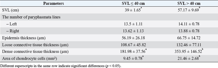 There was no significant difference (p=0.47) between the average number of paryphasmata rows left and right, the thickness of the epidermis, and loose connective tissue; whereas, the dense connective tissue was thicker (p =0.002) correspond to longer SVL (Table 1). The SVL linearly affects the chondrocyte cells’ area ( p =0.00016) following the equation: the area of chondrocyte cells=−1.87E7 + 7.09E5*SVL (Fig. 5). The determination coefficient of this linear regression was 93.7%, which means that the chondrocyte cell change area was 93.7% caused by SVL change.