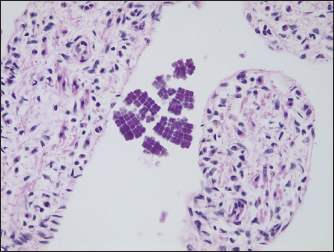 Fig. 5. Detail of the bundles formed by Gram-positive coccoid microorganisms (Gram, 1,000×). This microorganism has been associated with cases of bloat in 3 to 6 weeks-old lambs and in 10 days-old calves. Macroscopic lesions included edema and emphysema of the abomasal wall, hemorrhage, and mucosal hyperemia. Microscopically, bacteria with morphology compatible with Sarcina spp. were observed (Edwards et al., 2008). These authors mention that there is an evident association between abomasal bloat and Sarcina spp. in young animals of these species since the presence of fermentable carbohydrates and the tolerance of this microorganism to low pH allow its overgrowth. Vatn et al. (2000a) evaluated 67 lambs from 2 to 5 weeks of age with an abomasal disease, which presented, in comparison with controls, abomasal bloat, hemorrhages, and ulcers. In 79% of the cases, Sarcina-like bacteria were found in sections and smears from the abomasum. Sarcina ventriculi was isolated and identified from the abomasal content of one of these animals. Sarcina-like bacteria were found in 93% of lambs with abomasal bloat, suggesting an association between gas accumulation in the abomasum and the presence of Sarcina-like bacteria. In regard to horses, the role of Sarcina spp. in abdominal bloat is still debatable, as it has been found to be part of the normal microbiota (Perkins et al., 2012; Costa et al., 2015). Vatn et al. (2000b) mention in their work that they have found higher numbers of Sarcina-like bacteria in horses with acute gastric distention compared to controls. These authors emphasize that it is not known if the different sizes of the packets of these bacteria are related to different metabolic levels, or if they are different species. They also emphasize that, although these bacteria have been identified as part of the normal microbiota in this species, it has not been found in canines, lambs, or goats, therefore this could suggest certain differences between animal species (Vatn et al., 2000b). On the other hand, this microorganism has also been related to a case of gastric dilatation, vomiting, and chronic enteritis in a cat (Im et al., 2017). Although its presence is described as part of the normal small intestinal microflora in this species, therefore its potential pathogenic effect is also unknown (Ritchie et al., 2008). Owens et al. (2021) mention the finding of macroscopic and microscopic lesions in chimpanzees from Sierra Leone affected with "Epizootic neurologic and gastroenteric syndrome", which are congruent with the most severe forms of Sarcina infection in animals and humans. It should be noted that this group has studied the agent found in these animals, and they describe some differences between this isolate and others previously described, therefore they conclude that the genus Sarcina could comprise a wide variety of species ranging from commensal to pathogenic microorganisms. It is important to mention that Sarcina spp. is one of the few microorganisms that can be identified by their morphology, using light microscopy and classic Hematoxylin/Eosin staining. But it should be clarified that Micrococcus spp. can also occur in tetrads or packets, therefore, it is necessary to distinguish both microorganisms by some of their differences such as size (Micrococcus spp. is smaller than Sarcina spp.), and the tendency of Micrococcus spp. to form more compact clusters (Al Rasheed and Senseng, 2016). In this case, the size and characteristics of the clusters are more suggestive of Sarcina spp. In any case, it would be important to appeal to appropriate culture methodologies in order to isolate these agents. Both macroscopic and microscopic findings found in the case of this work evidence certain similarities with those described in the previously mentioned works, in which these bacteria are linked to rupture and abomasal bloat, as well as in human cases. It should be noted that no cardiac lesions were observed that could explain the sudden death of this animal, and the inflammatory lesions observed in the liver and lungs were mild and nonspecific, so they would not have had a relevant role in the death of the animal. The parasitic lesions were also mild and probably were not related to the death of the animal, since this horse did not show diarrhea or weight loss. The only relevant change observed was the severe digestive tympanism that could explain the death by producing respiratory failure. Many of the hemorrhagic and edematous alterations observed may be agonic (King et al., 2007). Considering that this microorganism is fastidious, and its isolation is usually difficult, it would be interesting to perform molecular techniques in order to identify these bacteria and to be able to link its presence with both macroscopic and microscopic findings. In view of the scarce information related to this microorganism, its presence as part of the normal microbiota and the differences between species, its possible role as a causal agent of abomasal bloat in goats, lambs, and calves, and the findings mentioned in this work, more studies are needed to relate its possible pathogenic role in other domestic species such as horses and cats, and if the increase in the amount of Sarcina spp. could be related to the presence of tympanism in horses. AcknowledgmentsThe authors would like to thank Escuela de Medicina y Cirugía Veterinaria San Francisco de Asís for their support. Conflict of interestThe authors declare that there is no conflict of interest. Authors contributionsLB: conceptualization, data collection, image capturing and editing, image analysis, and writing of the article. RO and PP: macroscopic and histopathological diagnosis. JH and FR: macroscopic diagnosis, reading, and revision of the manuscript. PC: clinical examination and diagnosis. DZ: histopathological techniques and stains. Critical revision of the manuscript was performed by all the authors. All authors read and approved the final ma