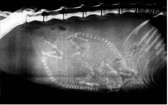 Fig. 2. Latero-lateral radiography of the ocelot. The image shows the presence of two fetuses in an advanced stage of development. An ultrasound (SonoScape, Portable Digital Color Doppler Ultrasound System Model S6V, Micro-Curved Array, 7.5 MHz) was performed to monitor fetal development and vitality. It was found that the fetuses were fully developed due to the differentiation of intestinal layers and the existence of intestinal peristalsis (Lopate, 2018). Both fetuses showed heart rates <150 beats/minutes, indicative of fetal stress (Traas, 2008a). Furthermore, low concentrations of progesterone were detected in the blood (2.1 ng/ml), but obstetric inspection did not show any signs associated with labor onset. Three hours later, the fetuses’ heart rate increased to normal values (Table 1), so the initial treatment was maintained, and a urinary catheter was placed to allow the emptying of the bladder. In the following hours, the female progressively stabilized, but 48 hours after admission, it was decided to perform a cesarean section; the fetuses' heart rate became critical again. The female continued to show no signs of labor progress. The ocelot was premedicated with fentanyl (3 μg/kg IV) for the safe handling of the animal. Anesthesia was induced with propofol (4 mg/kg IV) to allow intubation of the patient. It was maintained with 2.5% sevoflurane in oxygen at 1 l/minutes using a partial rebreathing system (Smiths Medical SurgiVet CDS 9000, Vernon Hills IL60061, USA). The dam was positioned in dorsal recumbency, and a ventral midline approach for cesarean was performed following a modified surgical technique from that described by Fossum et al. (2013), which included a more meticulous surgical skin preparation (trichotomy of the middle plus lateral abdominal region, and antisepsis with 4% soapy chlorhexidine gluconate solution plus 2% hydroalcoholic chlorhexidine gluconate solution), and reinforcement of skin closure (continuous intradermal pattern plus simple interrupted cutaneous pattern, both with 3-0 absorbable monofilament suture). Heart rate, respiratory rate, central temperature, mean arterial pressure, arterial oxygen saturation, end-tidal carbon dioxide concentration, and arterial oxygen concentration were monitored (Model CMS6000, Contec Medical Systems Co. Ltd, China) continuously during the surgery (Table 2). Administration of intravenous fluid (Lactated Ringer’s solution: 5 ml/kg/hours) started at induction and continued throughout surgery to maintain an emergency venous access. The total anesthesia time was 35 minutes, and the surgery lasted 20 minutes. Cardiorespiratory alterations were not detected during the procedure, and anesthetic recovery was smooth and without complications. Immediately after delivery, the newborns received neonatal care consisting of clamping the umbilical cord, suctioning fluids from nose and mouth with a bulb syringe, and rubbing with warm towels. To assess neonatal viability, an Apgar score test was performed 5 minutes after delivery (Veronesi et al., 2009). Both newborns were classified as critical (Table 3) and received resuscitation care following the protocol described by Traas (2008b). The neonate with the lowest score died within the first hour, while the other, with the highest score, increased their Apgar score 2 hours after birth and survived the procedure. Postoperative therapy for the dam included analgesic (pregabalin: 5 mg/kg PO q 12 hours for 30 days), anti-inflammatory (carprofen: 2.2 mg/kg PO q 12 hours for 5 days), antibiotic (amoxicillin-clavulanic: 20 mg/kg PO q 12 hours for 10 days and cefalexin: 30 mg/kg PO q 12 hours for 10 days) and vitamins (Vit E: 400 UI PO q 24 hours for 30 days). The specimen was placed in a resting cage (95 cm length × 50 cm width) for 8 days, after which it was transferred to a larger cell (200 cm length × 65 cm width) to assess its clinical evolution. No swelling or dehiscence of the surgical wound was observed during this period, and a progressive improvement in the patient's posture and locomotion was found. Four weeks after admission, the patient was neurologically reevaluated. Superficial sedation was performed (dexmedetomidine: 4 μg/kg IM plus ketamine: 2 mg/kg IM), and the recovery of the spinal reflexes of the four extremities could be verified. The dam was discharged and transferred to a wildlife rescue center 45 days after surgery, from where it was subsequently reintroduced into the wild. The surviving kitten was hand-reared following the techniques described by Edwards and Hawes (1997) for wild felids until self-feeding was safely established. At 3 months of age, the specimen was transferred to a rescue center where it is evaluated for release into the wild or inclusion in an environmental education program. Table 1. Fetus heart rates monitored by ultrasound.
