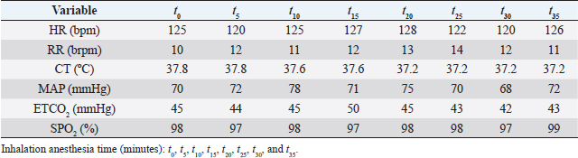 Table 2. Monitored intraoperative heart rate (HR), respiratory rate (RR), central temperature (CT), mean arterial pressure (MAP), end-tidal carbon dioxide concentration (ETCO2) and arterial oxygen concentration (SPO2).