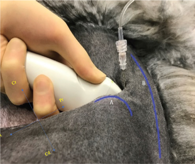 Fig. 3. Position of ultrasound transducer and needle performing the psoas compartment block, identifying the wing of the ilium (A) and the outline of the spine (B) Ethical approvalData for these alpacas were collected from clinical cases and used retrospectively for publication. The alpacas included in this case report received a high standard of care and all the procedures carried out (including monitoring and blood sampling) were part of the routine care of animals undergoing anesthesia at our institution. DiscussionPain is poorly described in camelid species. It has been suggested that pain may result in side effects , such as decreased gut motility (Abrahamsen, 2009), as well as being considered a welfare issue. Conversely, the use of systemic analgesia, like opioids (Boscan et al., 2006) or non-steroidal anti-inflammatory drugs (Radi, 2009), for example, may result in a number of adverse effects. Finding the correct approach to this clinical challenge may, therefore, be difficult. In humans, it is well established that a multimodal approach to analgesia with the use of different techniques and drugs with different mechanisms of action results in a number of benefits, from improved analgesia to a reduction of both the dose and possible side effects of the analgesics employed (Joshi et al., 2014). It is the authors’ opinion that achieving multimodal analgesia utilizing LAs may have an important impact for species in which the knowledge of systemic analgesic drugs is still limited. For this reason, the authors attempted to extrapolate the techniques of the PsC and SN blocks (Echeverry et al., 2010; Tayari et al. 2017) routinely performed by the authors as a part of the anesthetic management of small animal patients at our institution. In both cases in this report, the SN was easily identified with the aid of ultrasound and the spread of local anesthetic was clearly observed around the nerve following injection. However, interpretation of the psoas compartment was more complicated. While the identification of the IPM and FN was considered comparable to the canine models (Tayari et al., 2017), the ON was not clearly identifiable. Two main hypotheses can be made for this; 1) the relative small size of the ON in comparison to the FN or 2) the anatomical difference in the origin or trajectory of the ON through the psoas compartment. It is also worth mentioning that there is a lack of anatomical studies describing the specific innervation of the hind limb in the alpaca. While thought to be similar, it is possible that differences exist both between species and within the same species (a possibility for the cases in this report also). For instance, the ON was shown to provide innervation to the stifle in only 50% of the dog population (O’Connor and Woodbury, 1982). When differences across the species exist, the use of ultrasound- guided procedures permits the direct visualization of anatomical structures , therefore, partially overcoming this limitation. Furthermore, ultrasound guidance of a needle to these nervous structures, allows accurate application of LAs (Sites and Antonakakis , 2009) offering evaluable advantages in term of success rate and decreased incidence of complications, in comparison to either electro-location or blind techniques (Abrahams et al., 2009).