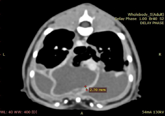 Fig. 3. Day 6: coronal view of a CT scan of the thorax showing contrast-enhancing pleural septations within pyothorax. The clients declined thoracostomy tube placement as the suggested first-line treatment and requested an esophagostomy tube to be placed to ensure enteral nutrition. Upon discussing the advantages and disadvantages of possible treatment options and techniques, the clients decided on a novel approach placing a pleural port device (PleuralPortTM, Norfolk Vet Products, Skokie, IL), limiting hospitalization time and to continue the treatment at home shortly after surgery. Both clients were in the human medical field (nurse and anesthetist). The cat was premedicated with methadone (Methone, Ceva Animal Health, Glenorie, Australia) 0.3 mg/kg IV, induced with alfaxalone (Alfaxan, Jurox Animal health, Crawley, UK) 1 mg/kg IV to effect and maintained under general anesthetic with isoflurane and oxygen. A right-side approach to the thoracic wall was elected based on the ultrasonographic distribution of the pleural effusion. A 4-cm skin incision was made in the dorsal 3rd of the chest wall at approximately the 10th intercostal space, tunneling to a second incision in the 8–9th intercostal space of the central chest area. An 18-gauge catheter and a 0.035″ J-tipped guide wire were then introduced. An eight French expander was used over the J-wire, and a seven French round tip fenestrated silicone tube was placed and secured with suture material in surrounding soft tissue around the thoracostomy tube entry site. The port was secured in the dorsal site with sutures to the fascia of the latissimus dorsi. Port patency was verified using a Huber point needle before and after skin closure. The skin closure was caudal to the port so that the incision line would not interfere with drainage and the healing of the skin would be favorable. Thoracocentesis and lavage of the pleural space were carried out before the surgical site’s closure with 250 ml of warmed sterile saline solution (0.9% NaCl, Baxter Healthcare Corp, Deerfield, IL). An esophagostomy tube was placed following the pleural port placement. Radiographs showed satisfactory positioning of the pleural port (Fig. 4). Lavage and drainage of the pleural space were successfully carried out following surgery using 50 ml of sterile saline solution q12 hours without complications.