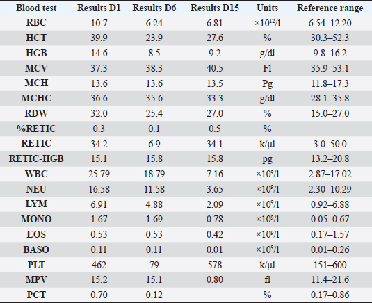AbstractBackground: Pyothorax in cats is treated with intravenous fluids and antibiotics, and while thoracotomy and debridement are less commonly necessary, thoracostomy tubes are the treatment of choice when repeated drainage of the pleural cavity is needed. Case Description: An 11-month-old British short-haired cat was presented for a sudden onset of lethargy, dyspnea, and tachypnea, following an ovariohysterectomy 10 days prior to the treatment process. Pyrexia and muffled cardiac sounds on the left hemithorax were noted. A hemogram indicated the development of anemia and neutrophilia with a left shift. Radiography and ultrasonography confirmed a pleural effusion, and a CT scan ruled out the presence of any masses or perforating foreign bodies. A PCR on the pleural effusion ruled out feline coronavirus infection, and fluid analysis was confirmed as a septic exudate with Pasteurella multocida infection. A pleural access port was used to treat the pyothorax that successfully reduced hospitalization time and lowered overall financial outlay despite surgical implantation. Conclusion: The present report describes the successful use of a pleural port to treat pyothorax in one cat. This is the first time such a device has been reported for the treatment of pyothorax. Keywords: Pleural effusion, Pleural port, Pyothorax, Thoracocentesis, Thoracostomy tubes. IntroductionPyothorax is reported in both younger and older cats as an accumulation of purulent material in the pleural space. Direct inoculation occurs after trauma, such as perforating bite wounds or surgery. Hematogenous or lymphatic spread and translocation from adjacent spaces such as the mediastinum or esophagus can also be causes of pyothorax. Previous studies have suggested that oral and pharyngeal bacteria and perioperative aspiration can act as contaminants resulting in pleural empyema (Barrs et al., 2005). The treatment for pyothorax includes intravenous fluids and antibiotic therapy in all cases. While thoracotomy and debridement are less often needed in cats than dogs, unilateral or bilateral thoracostomy tube placement has shown a high (95%) success rate and is the preferred treatment when repeat drainage is necessary (Barrs et al., 2005). Newer and narrower thoracostomy tubes are less traumatic and more comfortable for the patients, especially in feline patients where the diameter might cause more discomfort and trocar use is discouraged (Valtolina and Adamantos, 2009). Introduction with a guide-wire reduces trauma and decreases the discomfort and complication rates associated with larger bore catheters. The average time of thoracic drainage via thoracostomy tubes ranges from 3 to 15 days (Barrs et al., 2005). Potential dislodgment of the tube along with bacterial introduction causes potential complications and warrants close monitoring during hospitalization. Postoperative care in an intensive care unit (ICU) is common practice after tube thoracostomy (Valtolina and Adamantos, 2009). Novel surgical approaches for the treatment of pleural effusion include the placement of pleuroperitoneal or pleurovenous shunts and omentalization, but these are not indicated in inflammatory, neoplastic, or infectious effusions due to the risk of spread to another body cavity (Brooks and Hardie, 2011). The use of vascular access ports with drains attached (Cahalane et al., 2007), and more recently of a pleural port device provided favorable outcomes for treating various types of effusions and pneumothorax (Brooks and Hardie, 2011; Cahalane and Flanders, 2012). Case DetailsThis report describes the treatment of pyothorax in a cat with a pleural access port, a controversial although novel approach not yet reported in the literature. An 11-month-old British short-haired cat presented for a sudden onset of dyspnea, lethargy, and hyporexia to the emergency service of the Veterinary Medical Center of the City University of Hong Kong. The cat had been spayed 2 weeks before presentation, and shortly after suture removal, the owner had observed lethargy, hyporexia, and increased respiratory effort. Upon physical examination on day 1, there was tachypnea with a respiratory rate of 80 bpm (RR; 20–30), the heart rate was 190 (RR; 150–200), and pyrexia of 39.5°C (37.7–39.1°C). A hemogram (Table 1) showed neutropenia, lymphocytosis, and monocytosis that after correction on the cytological examination was revealed to be left shift neutrophilia instead. Additionally, there was marginal hyponatremia 148 mmol/l (RR; 150–165). Feline immunodeficiency virus and feline leukemia virus were both negative on an ELISA test (SNAP 4Dx Plus, IDEXX Laboratories, Westbrook, ME). Oxygen saturation was consistent with severe hypoxemia (<90%). Radiographs of the thoracic portion revealed pleural effusion that obscured the cardiac silhouette (Fig. 1). A cardiogenic cause of the effusion was ruled out by echocardiography. Table 1. Hemogram results during hospitalization on day 1 and day 6 and at revisit on day 15.