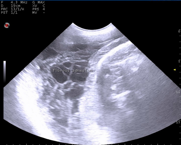 Fig. 1. Ultrasonographic examination with trans-abdominal probe at frequency 3.5–5 MHZ showing long standing uterine torsion case with severe degree at full term suffered from failure of detorsion due to presence of uterine adhesion with fibrin threads.
