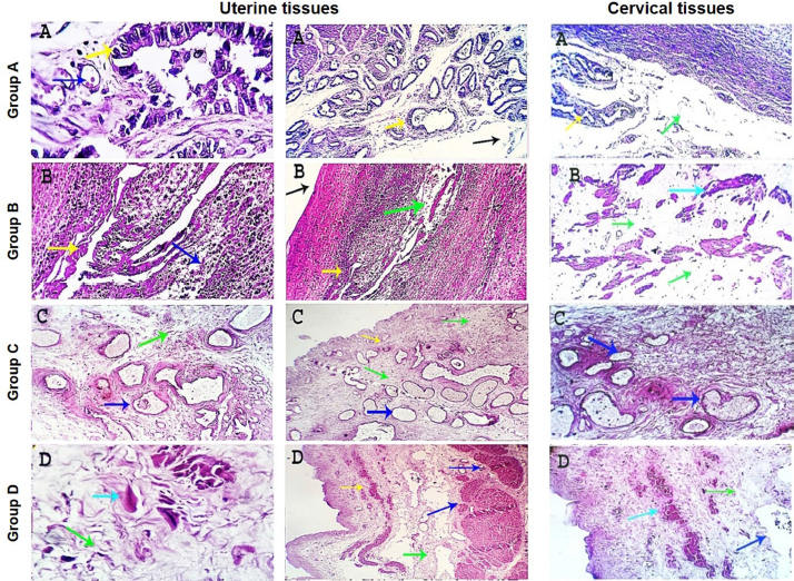 Fig. 2. Photomicrographs of uterine and cervical specimens stained with eosine and hematoxylin. Control uterine and cervical tissues revealed apparently normal micro-morphological structures (A). Uterine and cervical tissues of uterine torsion affected cases revealed extensive histopathological changes in variable intensities (B–D). Endometrial lining (black arrow), endometrial and endocervical glands (yellow arrows), blood vessels (dark blue arrows), muscular coat (light blue arrows) and intermuscular tissue (green arrows). X=100, 200, and 400. Immunohistochemical findings of VEGFThe most prominent VEGF expression was detected in the control group (85%–90%) with dark brownish nuclear and cytoplasmic stainabilities in almost all vascular endothelial and subendothelial tissues (Fig. 4A). The degrees of nuclear-cytoplasmic staining expression were significantly lower (p < 0.05) in uterine torsion cases, where it was moderately expressed (55%–60%) in group B, mildly to moderately expressed (35%–45%) in group C, and mildly expressed (15%–25%) in group D (Fig. 4B–D). DiscussionUterine torsion is termed as twisting of the gravid uterine horn around its longitudinal axis, which results in narrowing the birth canal and is usually followed by incomplete cervical dilatation (Kumar et al., 2014). It adversely affects the profitability as well as survivability of affected cases as it leads to the death of the dam, fetus or both , and impaired lactation if not treated early (Jeengar et al., 2015; Prakash et al., 2018). Incomplete cervical dilatation is a common cause of maternal dystocia in farm animals, which can occur alone or in association with other forms of dystocia such as torsion (Balamurugan et al., 2018). Our initial data revealed that after successful detorsion, the cervix showed variable degrees of incomplete cervical dilatation. In line with our finding, most cases were accompanied by a closed or incompletely dilated cervix rather than an opened or fully dilated cervix after detorsion (Jeengar et al., 2015). Our study reported that the degree and duration of uterine torsion from its occurrence till its presentation can influence the prognosis of uterine torsion affected animals. This result is consistent with the early findings which showed that the prognosis of uterine torsion cases is highly influenced by the degree and duration of uterine torsion and the presence of signs of approaching of parturition (Prabhakar et al., 1995; Schonfelder et al., 2005). We also reported that cases suffered from severe degree and prolonged duration of uterine torsion developed extensive uterine adhesion with adjacent abdominal organs with massive parametritis and peritonitis and did not respond to the detorsion procedure. Thus, these cases were culled because caesarean section was not useful in these cases. Because incision of the uterus during cesarean operation in prolonged cases of uterine torsion leads to drain of uterine content into abdominal cavity resulting into severe peritonitis and eventually death of dam (Purohit et al., 2013).