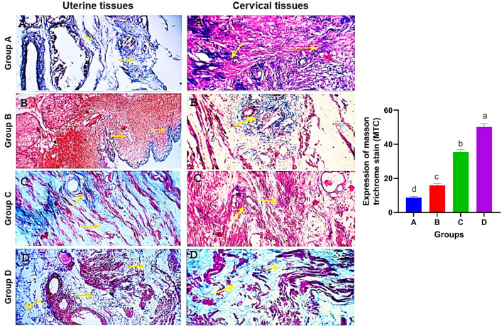 Fig. 3. Photomicrographs of uterine and cervical specimens stained with masson trichrome stain. Control tissues showed a normally presented collagen fibers (A). Collagen deposition appears marked as dark blue fibrils in uterine torsion affected cases (B–D). Fibroblasts and collagen are indicated by yellow arrows. X=200. Mean values of masson trichrome stain expression. Columns with different letters indicates a significant difference (p < 0.05).