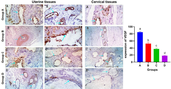 Fig. 4. Photomicrographs of uterine and cervical specimens showing expression of VEGF in tissues of control group (A) and uterine torsion affected groups (B–D). Mean values of vascular endothelial growth factor expression. Columns with different letters indicates a significant difference (p < 0.05). Histopathological examination of uterine and cervical specimens with eosine and hematoxylin stain was conducted to evaluate histopathological alterations in uterine and cervical tissues and their relation to dilatation capacity of the cervix in normally calved and uterine torsion affected buffaloes. Results showed extensive histopathological changes in uterine torsion affected cases compared to normally calved cases as a result of the damaging effect of uterine torsion. In line with our finding, uterine torsion has been reported to be associated with a variable degree of histopathological changes in uterine and cervical tissue (Malik et al., 1990; Singh et al., 2010). Furthermore, histochemical examination of uterine and cervical specimens with masson trichrome stain was conducted to evaluate collagen concentrations, which revealed a characteristic tissue injury with consequent fibroplasia and collagen deposition, particularly in the sub-endometrial and in the superficial and middle myometrial interstitial tissues. Moreover, the results of the present study clearly indicated a marked collagen deposition in cases that suffer from incomplete cervical dilatation after detorsion, which hinders the dilatation capacity of the cervix, even after the therapeutic approach. These results are in accordance with previous studies reported that an extensive collagen deposition in the cervical matrix in uterine torsion cases with a severe degree and prolonged duration (Honparkhe et al., 2009; Singh et al., 2010). VEGF, a hypoxia–inducible representative marker, is a multifunctional cytokine that plays a key role in uterine vascularity, stimulates angiogenesis, and increases microvascular permeability (Görük and Deveci, 2018). Recent investigations reported a reduced VEGF expression in pathological placentas, pregnancies compromised by preeclampsia and fetal growth restriction (Babischkin et al., 2019; Gualdoni et al., 2021). Interestingly, the immuno-histochemical investigation of VEGF revealed different vascular endothelial and subendothelial tissue expression responses depending upon the degrees of vascular dynamic blood hemostasis and micro-structural tissue configurations. In this study, expression was evaluated in both uterine and cervical tissues of normally calved and uterine torsion affected buffaloes. We also demonstrated for the first time that the expression of VEGF was higher in normally calved cases than uterine torsion affected cases due to extensive vascular damage produced by uterine torsion, which leads to destruction of VEGF receptors in endothelial cells of blood vessels and more tissue damage due to failure of the angiogenesis process. Suggesting that VEGF can be used as an indicator for torsion-induced incomplete cervical dilatation. ConclusionIncomplete cervical dilatation, the major obstacle facing vaginal fetal delivery following successful detorsion, is significantly linked with elevated collagen concentrations in uterine and cervical tissues, and lower expressions of VEGF caused by tissue damage due to failure of the angiogenesis process can serve as a novel marker for torsion-induced incomplete cervical dilatation in Egyptian buffaloes. Prospective studies are required to evaluate the potential clinical applications of serum or urine VEGF levels in predicting the respond of uterine torsion affected cases to rolling procedures and the cervix to dilatation following successful detorsion. Authors’ contributionAB designed the experiments, AI performed the experiments and wrote the first draft of the manuscript, HAA, ASE, and NM provided assistance and AM analyzed the data, revised and edited the manuscript. Conflict of interestThe authors declare that there is no conflict of interest. ReferencesBabischkin, J.S., Aberdeen, G.W., Lindner, J.R., Bonagura, T.W., Pepe, G.J. and Albrecht, E.D. 2019. Vascular endothelial growth factor delivery to placental basal plate promotes uterine artery remodeling in the primate. Endocrinology 160, 1492–1505. Balamurugan, B., Kharayat, N., Lavanya, M., Kumar, A., Ramamoorthy, M., Sushobhit, K., Deepesh Gautam, D.J. and Katiyar, R. 2018. Dystocia due to incomplete cervical dilation concurrent with cervico-vaginal prolapse in cattle: a case report. J. Entomol. Zool. Stud. 6, 544–545. Balasopoulou, V., Zablotski, Y., Zerbe, H. and Voigt, K. 2022. Retrospective analysis of 302 ovine dystocia cases presented to a veterinary hospital with particular attention to uterine torsion. Vet. Med. Sci. 8, 1683–1693. Breeveld-Dwarkasing, V., Struijk, P., Lotgering, F., Eijskoot, F., Kindahl, H., Van Der Weijden, G. and Taverne, M. 2003a. Cervical dilatation related to uterine electromyographic activity and endocrinological changes during prostaglandin F2α-induced parturition in cows. Biol. Reprod. 68, 536–542. Breeveld-Dwarkasing, V., Te Koppele, J., Bank, R., Van Der Weijden, G., Taverne, M. and van Dissel-Emiliani, F. 2003b. Changes in water content, collagen degradation, collagen content, and concentration in repeated biopsies of the cervix of pregnant cows. Biol. Reprod. 69, 1608–1614. de Carvalho, J.C., Lainetti, P.d.F., Alonso, J.d.M., Souza, F.F. and Ferreira, J.C.P. 2022. Ultrasonographic and haematology findings as an indicator of uterine torsion prognosis in cattle. Vet. Rec. Case Rep. e456. Dhami, A., Pateliya, C.S., Patel, J., Patel, S. and Makwana, H. 2019. Incidence of uterine torsion and related factors in buffaloes of amul milk shed area. Indian J. Vet. Sci. Biotechnol. 15, 17–20. Frazer, G.S., Perkins, N.R. and Constable, P.D. 1996. Bovine uterine torsion: 164 hospital referral cases. Theriogenology 46, 739–758. Ghuman, S. 2010. 
