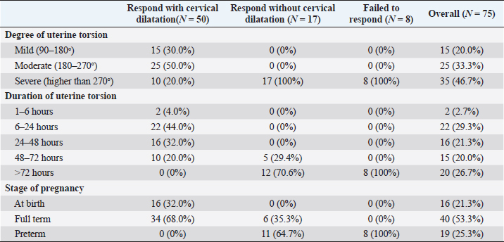 AbstractBackground: Uterine torsion, the most complicated cause of maternal dystocia recorded in bovine, usually followed by incomplete cervical dilatation after successful detorsion, which interfere with vaginal fetal delivery. Aim: This study aimed to evaluate the histopathological changes, variable collagen concentrations, and vascular endothelial growth factor expressions in uterine and cervical tissues following successful detorsion. Methods: Animals were classified into four groups; normally calved cases (group A), cases that respond successfully to detorsion and followed by vaginal fetal delivery without (group B) or with (group C) cervical laceration, and cases that suffered from failure of complete cervical dilatation after successful detorsion (group D). Results: Histopathological findings revealed variable changes in all uterine torsion affected groups, which were characteristic and marked in animals that suffered from failure of complete cervical dilatation following successful detorsion. Moreover, failure of cervical dilatation was associated with the highest collagen concentrations as shown by Masson trichrome stain. On the other hand, immunohistochemical findings showed that the normally calved cases have the highest vascular endothelial growth factor expression compared with animals that suffered from failure of complete cervical dilatation. Conclusion: Our results showed that the vascular endothelial growth factor is essential for cervical dilatation and its lower expression is accompanied by incomplete cervical dilatation following successful detorsion. Keywords: Uterine torsion, Buffaloes, Histopathological, Collagen, Vascular endothelial growth factor. IntroductionUterine torsion is the rotation of the pregnant uterine horn along its longitudinal axis, which leads to stenosis of the birth canal, resulting in dystocia (Balasopoulou et al., 2022; de Carvalho et al., 2022). It is the most common cause of dystocia in buffaloes (Nanda et al., 2003) and is commonly observed in pluriparous animals at the time of delivery or during the last month of gestation (Dhami et al., 2019). Surprisingly, the exact cause of a higher incidence of uterine torsion in buffaloes continues to be poorly understood, but the most logical explanation for the twisting of a pregnant uterus on its axis appears to be the unbalance of the uterus during unicornual pregnancy and excessive fetal or dam movements (Purohit et al., 2011). Uterine torsion is commonly followed by incomplete cervical dilatation and uterine inertia, so it should be handled as an emergency case in order to increase the survivability of the dam and livability of the fetus (Purohit and Gaur, 2014). It is well recognized that the incomplete cervical dilatation constitutes a major problem facing vaginal fetal delivery after successful correction of uterine torsion (Sahu et al., 2019). Collagen is the most myriad protein in the cervix and fibrillar collagen is the essential structural protein that influences the tensile characteristics of the cervix (Leppert, 1995; Ouellette et al., 2022). An essential requirement for cervical dilatation is softening of the cervix caused by decreased cervical tensile strength and change of collagen structure with the approach of parturition by decreasing collagen crosslinking and increasing its solubility (Timmons et al., 2010). Cervical ripening is a complex process that requires the association of hormonal actions, inflammatory reactions, and enzymatic breakdown of collagen (Balamurugan et al., 2018). Interestingly, the viscoelastic characteristics of the cervix, which are responsible for the dilatation of the cervix, are disturbed following the uterine torsion, producing a variable amount of cervical ischemia, leading to hypoxic degeneration of the cervical epithelium, obvious damage of elastic fibers, and incurable coagulative necrosis of smooth cells in the cervical tissue (Breeveld-Dwarkasing et al., 2003a). It has been reported that the uterine torsion has detrimental effects on cervical and uterine tissue, which is highly variable according to the degree and duration from occurrence till its handling. The limited arterial supply and venous return in the twisted uterus lead to hypoxia, ischemia, and necrosis, causing incurable damage to the endometrium, myometrium, and finally death of the fetus (Pearson and Denny, 1975; Frazer et al., 1996). Moreover, continued failure of blood supply results in loss of uterine wall elasticity and viability, and thus the uterine wall becomes necrosed, fragile, brittle, and susceptible to rupture (Ghuman, 2010). One of the efficient mechanisms used to enhance the oxygenation of hypoxic tissue to repay for these damaging effects is the induction of angiogenesis (Marti et al., 2000). Angiogenesis is defined as the formation of new blood vessels by the outgrowth of endothelial cells from pre-existing vessels (Holmes and Sleeman, 2000). Among the factors that have the ability to modify angiogenesis is vascular endothelial growth factor (VEGF), also known as vascular permeability factor, which is the best marker for a specific regulator of endothelial cell growth and differentiation (Gifre-Renom et al., 2022). Expression of VEGF is induced in cells suffered from ischemia or hypoxia (Hu et al., 2022). To the best of authors’ knowledge, VEGF has not been measured in cases of torsion-induced incomplete cervical dilatation. We hypothesized that the VEGF expression in uterine and cervical tissues may be altered in cases suffering from uterine torsion, and that may be the reason behind the lower possibility of complete cervical dilatation. We also investigated whether elevated collagen concentrations in uterine and cervical tissues are correlated with the degree of cervical dilatation after successful detorsion. Such correlation would suggest new approaches to both successful treatment and improving the survivability of the dam and livability of the fetus. Materials an