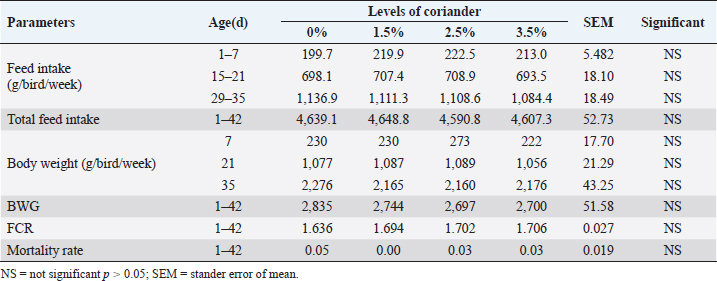 Statistical analysisThe calculations and statistical analyses were carried out by using a spreadsheet (Microsoft Excel) and the Minitab software package, respectively. The analysis of variance was used for preliminary analysis of data by using the general linear model (procedure). Normality test was applied on all data residuals and all the variables passed this test (p < 0.01). Tukey’s test was used for comparing the mean values of the variables. Ethical approvalAll applicable international and national guidelines for the care and use of animals were followed. ResultsGrowth performanceThe results showed that the supplementation of coriander seed powder at different levels had no significant effect (p > 0.05) on growth performance, as well as mortality rates, of the chickens during the experimental period (Table 3). Table 3. Effect of coriander seed powder at different levels (g/kg DM) on growth performance and mortality rate at different ages.
