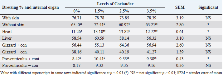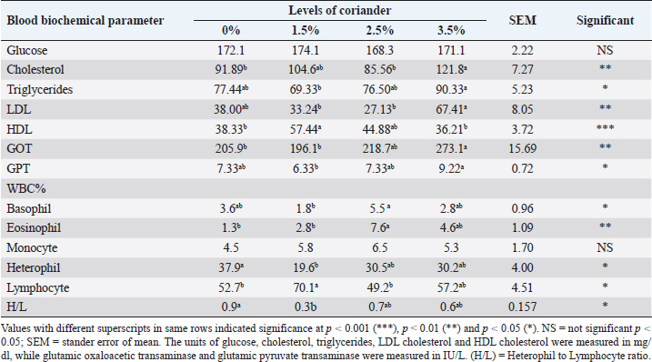 Performance parametersDuring the rearing period, FI and individual body weights were monitored on a weekly basis per pen. On the other hand, the body weight gain (BWG) and feed conversion ratio (FCR) were consequently calculated. Mortality of birds was also recorded on a daily basis for each group. At the end of the experiment, the dressing percentage was estimated by randomly selecting five chickens from every replicate for each treatment level; they were weighed, recorded, and sacrificed according to the Islamic way, by severing the right and left carotids and jugular vessels, trachea, and esophagus. Generally, the carcass weight was recorded immediately after plucking or skinning and evisceration; this is commonly known as the hot hanging weight for determining carcass yield. After complete bleeding, two of the sacrificed chickens were scalded in hot water, hand plucked, washed, and reweighed, while the other three chickens from each replicate were skinned, weighed, and recorded. Then, the head was removed at a point close to the skull. Feet shanks were also removed at the hock joint and eviscerated characteristics for carcass was carried out (Rashid et al., 2014). The internal organs (heart, liver, proventriculus, and gizzard) were collected, weighed, and measured as well. Blood collectionThe blood samples were collected from three chickens of each replicate, in aggregate of nine chickens of each treatment that were randomly selected, labeled, and placed into separate cages and fasted overnight for blood sampling. The blood was withdrawn from the ulnar vein at the end of the trial. Blood samples were kept in two types of test tubes, where half of the sample was placed into anticoagulant tubes (EDTA tube Kҙ EDTA) and was used for measuring the white blood cell counts and the heterophil/lymphocyte (H/L) ratio as described by Shoukary et al. (2017), whereas the other half of the sample was collected into pro-coagulation clot activator tubes and centrifuged for 10 minutes at 3,000 rpm to obtain the serum and stored in the freezer at –21°C for 24 hours. The samples were analyzed for glucose, total cholesterol, triglycerides (TG), high-density lipoprotein (HDL), and low-density lipoprotein (LDL) using specific kits (Ghazanfari et al., 2015), while the glutamic oxaloacetate transaminase (GOT) and glutamate pyruvate transaminase (GPT) were measured as described by Saleh et al. (2014). Table 2. The chemical composition (g/kg) of coriander seed powder.