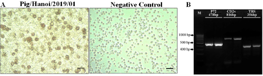 Fig. 2. HAD assay and PCR verification for virus isolation. (A) HAD assay of the spleen homogenate. The 10-times dilution of the supernatant of the homogenate was inoculated into PAM cells with 1% pig red blood cells. HAD was observed for 4 days. Scale bar: 200 μm. (B) PCR detection of ASFV isolated in PAM cells, including p72, CD2v, and TRS of ASFV genome.