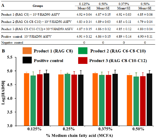 Fig. 5. MCFA pre-treated feed in exposure to 1 × 105 HAD50/g feed of Pig/Hanoi/2019/01 strain after 24-hour post-inoculation. The ASF virus collected from feed exposed and then, HAD assay was performed for the viral titration in MCFAs treated feeds. Data are presented as the mean ± SEM of three independent experiments: (a) p < 0.05 and (b) p < 0.01. The antimicrobial activities of MCFA have been reported previously. Some studies have suggested the potential antiviral effects of caprylic acid (C8) and/or C10 on vesicular stomatitis virus or visa virus (Zentek et al., 2011). Additionally, the synergistic effects of MCFAs have shown more effective against pathogens when compared to their individual form in which combined effects of C8 and C10 caused a significant decline of bacterial flora, while no efficacy was found by individual C8 or C10 (Dierick et al., 2002). As the shortest member of the MCFA family, caproic acid C6 and its antimicrobial effects on bacterial growth have been reported in previous studies in which at the dose of 25 μg/ml, this acid has shown a complete inhibition of Actinobacillus actinomycetemcomitans growth, a gram-negative bacterium (Huang et al., 2011). The significant activities of C6 in combination with C8 and C10 against PEDV in previous study and our current ASFV experiment indicated that, this compound possessed both anti-bacterial and viral properties. Also, other studies have demonstrated that among all MCFAs, C12 componentis majority of antibacterial activities (Petschow et al., 1996; Vande Maele et al., 2016). The role of C12 component in synergistic MCFAs was markedly noted in our feed experiment, suggesting the susceptibility of lauric acid C12 to viral pathogens. Further studies are essential to elucidate the chemical properties and antiviral activities of this compound. The anti-bacterial effects on MCFAs have been reported in both in vitro and in vivo studies; however, the study of their effects on viral pathogens are limited. Although, it is difficult to be definitive regarding to molecular mechanism underlying MCFA, both individual and synergistic forms, activities against ASFV infectivity, it could be investigated in further studies, particularly in vivo model. ConclusionTo the authors’ knowledge, it is the first report on MCFA-activities against ASFV in in vitro feed model. Our findings suggested that the MCFAs possessed the potent activities as an antiviral feed mitigant on ASFV infectivity in vitro, and the synergistic forms of MCFAs (C6-C8-C10 and/or C8-C10-C12) have shown stronger anti-ASFV activities in vitro when compared to the individual form of MCFA(C8). Additionally, the effects of MCFAs on ASFV infectivity are dose- and component-dependent. Further studies focusing on in vivo anti- ASFV effects of MCFA are important to bring new insight into the mode of ASFV-reduced action of these compounds. AcknowledgementsThis work was supported by the Ministry of Science and Technology to Hoang Vu Dang (Project code: ĐTĐL.CN-75/19). The authors would like to thank the Royal Agrifirm Group for providing the funding and in-kind resources necessary to complete this project Authors’ contributionsHTTT, ADT, and HVD conceived and designed the experiments. HTTT, ADT, DVL, TVH, CTN, NTC, HTN, and ADT performed the experiments. HTTT, ADT, KL, GB, and HVD analyzed the data. HVD and KL contributed the reagents, materials, and analytical tools. HTTT, ADT, MDV, KL, GB, and HVD wrote the manuscript. All authors read and approved the final manuscript. Conflict of interestThe authors declare that they have no competing interests. ReferencesChapman, D.A., Darby, A.C., Da Silva, M., Upton, C., Radford, A.D. and Dixon, L.K. 2011. Genomic analysis of highly virulent Georgia 2007/1 isolate of African swine fever virus. Emerg. Infect. Dis. 17, 599–605. Chenais, E., Depner, K., Guberti, V., Dietze, K., Viltrop, A. and Stahl, K. 2019. Epidemiological considerations on African swine fever in Europe 2014-2018. Porcine Health Manag. 5, 6. Cochrane, R.A., Dritz, S.S., Woodworth, J.C., Huss, A.R., Stark, C.R., Hesse, R.A., Zhang, J., Tokach, M.D., Bai, J. and Jones, C.K. 2015. Evaluating chemical mitigation of porcine epidemic diarrhea virus (PEDV) in swine feed and ingredients. Kansas Agricultural Experiment Station, Research Reports No. 1. Cwynar, P., Stojkov, J. and Wlazlak, K. 2019. African swine fever status in Europe. Viruses 11(4), 310. Davies, K., Goatley, L.C., Guinat, C., Netherton, C.L., Gubbins, S., Dixon, L.K. and Reis, A.L. 2017. Survival of African swine fever virus in excretions from pigs experimentally infected with the georgia 2007/1 isolate. Transbound. Emerg. Dis. 64, 425–431. Dee, S., Neill, C., Clement, T., Christopher-Hennings, J. and Nelson, E. 2014. An evaluation of a liquid antimicrobial (Sal CURB®) for reducing the risk of porcine epidemic diarrhea virus infection of naive pigs during consumption of contaminated feed. BMC Vet. Res. 10, 220. Dierick, N.A., Decuypere, J.A., Molly, K., Van Beek, E. and Vanderbeke, E. 2002. The combined use of triacylglycerols (TAGs) containing medium chain fatty acids (MCFAs) and exogenous lipolytic enzymes as an alternative to nutritional antibiotics in piglet nutrition: II. In vivo release of MCFAs in gastric cannulated and slaughtered piglets by endogenous and exogenous lipases; effects on the luminal gut flora and growth performance. Livest. Prod. Sci. 76, 1–16. Dixon, L.K., Islam, M., Nash, R. and Reis, A.L. 2019a. African swine fever virus evasion of host defences. Virus Res. 266, 25–33. Dixon, L.K., Sun, H. and Roberts, H. 2019b. African swine fever. Antiviral Res. 165, 34–41. Eble, P.L., Hagenaars, T.J., Weesendorp, E., Quak, S., Moonen-Leusen, H.W. and Loeffen, W.L.A. 2019. Transmission of African swine fever virus via carrier (survivor) pigs does occur. Vet. Microbiol. 237, 108345. Eustace Montgomery, R. 1921. On a form of swine fever occurring in British East Africa (Kenya Colony). J. Comp.