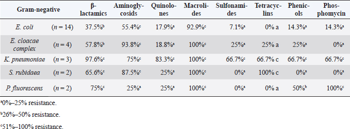 Fig. 1. Percentage of resistance to antimicrobial classes tested. Upon our results, we recommend sulfonamides as the first choice of antimicrobial treatment (Fig. 1). Although there are many studies describing antimicrobial resistance in equine medicine, as far as authors know, none of them focus on the oral microbiota. Furthermore, bacterial resistance profiles change rapidly over time (Canton et al., 2008), remarking the importance of continuous surveillance. The more we know about equine oral microbiota as well the related patterns of resistance, the better we can implement an antimicrobial protocol for some diseases. Moreover, the potential for human to be exposed to resistant bacteria via close contact with horses is a problem that has received much attention (Maddox et al., 2012) Serratia rubidaea strains belong to samples collected from two horses from different stables. Their pattern of resistance demonstrates a phenotypic resistance to all the macrolides, tetracycline and meropenem, one of the carbapenems tested. One of the isolates presented resistance to all the aminoglycosides tested. Serratia rubidaea has already been isolated by Litterio et al. (2012) from an infected wound created by a horse bite in a 2-year-old boy. It is now possible to consider that the origin of this agent could be the horse’s mouth instead of the contamination with soil particles found in the wound. The possibility of wound infection by MDR S. rubidaea after a horse’s bite should be considered in human medicine, particularly in ridders or horse owners. Serratia rubidaea has also been reported as the cause of bacteraemia in a 15-year-old patient by Gentille et al. (2014), and in a 54-year-old patient by Sekhsokh et al. (2007). The Serratia rubidaea MDR profile should be considered in human medicine in cases of bacteraemia caused by this agent. The antimicrobial protocol used should be prudent and always based on microbiologic culture and in vitro antimicrobial susceptibility testing to make sure what is the best antibiotic for that strain. As far as this study goes, sulfonamides, amphenicols, and fosfomycin are good antimicrobial options. Table 1. Resistance rates toward AM classes tested. Only bacterial species with at least 2 tested isolates are shown.