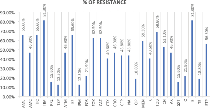 Fig. 2. Percentage of resistance of each antimicrobial. (AML10): amoxicillin; (AMC30): amoxicillin/clavulanate; (TIC75): ticarcillin; (TIM85): ticarcillin-clavulanic acid; (PRL100): piperacillin; (TZP110): piperacillin-tazobactam; (ATM30): aztreonam; (KF30): cephalothin; (IMP10): imipenem; (FOS50): Fosfomycin; (FOX30): cefoxitin; (CAZ30): ceftazidime; (CTX30): cefotaxime; (CRO30): ceftriaxone; (CFP30): cefoperazone; (NA30): nalidixic acid; (CIP5): ciprofloxacin; (MEM10): meropenem; (K30): kanamycin; (TOB10): tobramycin; (CN10): gentamicin; (AK30): amikacin; (SXT25): trimethoprim-sulfamethoxazole; (C30): chloramphenicol; (E15): erythromycin; (TE30): tetracycline; (ETP10): ertapenem. Although rare, these infections can occur, and the etiologic agent could be cross-transmitted from the horse’s oral cavity with the particular concern of the massive MDR of these strains. Serratia rubidaea could make part of equine oral microbiome probably because of its presence in water, vegetables and soil. All individuals that work with horses, mostly veterinarians and dentists, which are in close contact with the horse’s mouth, should take these results into account and assure good clinical practices like the use of gloves during an oral examination. As mentioned by Spijk et al. (2016), these kind of studies aid practitioners in making an evidence based antimicrobial choice when prompt therapy is needed. The fact that all these zoonotic and MDR agents were found in healthy horses from two distinct equestrian centers, that were not submitted to antimicrobial treatment in the previous 6 months, is a strong reason to consider the horse as an animal with a major place in the “One Health” concept. Given the high number of MDR isolates (n=27), this study praises the importance of the antimicrobial sensitivity tests to adjust an antimicrobial protocol preventing the development of resistances. To the best of authors’ knowledge, this is the first report of the isolation of S. rubidaea from the mouth of healthy horses, and with resistance to antibiotics clinically relevant in human medicine which are used only in hospital settings (e.g., meropenem). AcknowledgementsThis work is supported by National Funds by FCT—Portuguese Foundation for Science and Technology, under the projects UIDB/04033/2020 and UIDP/04033/2020 (CITAB-Center for the Research and Technology of Agro-Environmental and Biological Sciences) and Associate Laboratory Inov4Agro-Institute for Innovation, Capacity Building and Sustainability of Agri-food Production. The research unit CECAV- Animal and Veterinary Research Centre and Associate Laboratory for Animal and Veterinary Science - AL4AnimalS received funding from the FCT, reference of the project UIDB/CVT/0772/2020. Conflict of interestThe authors declare that they have no competing financial interests or personal relationships that could have appeared to influence the work reported in this paper. Authors’ contributionMJS and MC contributed conception and design of the study; JP and MC collected the samples; JP, MJS, GS and MC performed all the laboratory assays; JP wrote the first draft of the manuscript; JP, MJS, GS and MC critically revised the manuscript. All authors contributed to manuscript revision, read, and approved the submitted version. ReferencesBindu, B.S., Mishra, D.P. and Narayan, B. 2015. Inhibition of virulence of Staphylococcus aureus—a food borne pathogen—by squalene, a functional lipid. J. Funct. Foods 18, 224–234. Bourély, C., Cazeau, G., Jarrige, N., Haenni, M., Gay, E. and Leblond, A. 2020. Antimicrobial resistance in bacteria isolated from diseased horses in France. Equine Vet. J. 52, 112–119. Canton, R., Novais, A., Valverde, A., Machado, E., Peixe, L., Baquero, F. and Coque, T. 2008. Prevalence and spread of extended- spectrum beta-lactamase-producing Enterobacteriaceae in Europe. Clin. Microbiol. Infect. 14, 144–153. Clinical and Laboratory Standards Institute (CLSI). 2020. Performance standards for antimicrobial susceptibility testing, 30th ed. Wayne, PA: CLSI. Damborg, P., Marskar, P., Baptiste, K. and Guardabassi, L. 2012. Faecal shedding of CTX-M-producing Escherichia coli in horses receiving broad spectrum antimicrobial prophylaxis after hospital admission. Vet. Microbiol. 154, 298–304. Dolejska, M., Duskova, E., Rybarikova, J., Janoszowska, D., Roubalova, E., Dibdakova, K., Maceckova, G., Kohoutova, L., Literak, I., Smola, J. and Cizek, A. 2011. Plasmids carrying blaCTX-M-1 and qnr genes in Escherichia coli isolates from an equine clinic and a horseback riding centre. J. Antimicrob. Chemother. 66, 757–764. Gao, W., Chan, Y., You, M., Lacap-Bugler, D., Leung, W. and Watt, R. 2016. In-depth snapshot of the equine subgingival microbiome. Microb. Pathog. 94, 76–89. Gentille D., Pérez M. and Centelles M. 2014. Bacteremia by a Serratia rubidaea with an atypical quinolones resistance phenotype. Rev. Chilena Infectol. 31, 351–352. Isgren, C. 2018. Antimicrobial resistance in horses. Vet. Rec. 183, 316–318. Karkey, A., Joshi, N., Chalise, S., Joshi, S., Shrestha, S., Nguyen, T., Dongol, S., Basnyat, B., Baker, S. and Boinett, C. 2018. Outbreaks of Serratia marcescens and Serratia rubidaea bacteremia in a central Kathmandu hospital following the 2015 earthquakes. Trans. R. Soc. Trop. Med. Hyg. 112, 467–472. Litterio, M., Arazi, S., Hernández, C. and Lopardo, H. 2012. Isolation of Serratia rubidaea from a mixed infection after a horse bite. Rev. Argent. Microbiol. 44, 272–274. Maddox, T., Clegg, P., Diggle, P., Wedley, A., Dawson, S., Pinchbeck, G. and Williams, N. 2012. Cross-sectional study of antimicrobial-resistant bacteria in horses. Part 1: Prevalence of antimicrobial resistant Escherichia coli and methicillin-resistant Staphylococcus aureus. Equine Vet. J. 44, 289–296. Maddox, T., Clegg, P., Williams, N. and Pinchbeck, G. 2015. Antimicrobial resistance in bacteria from horses: epidemiology of antimicrobial resistance. Equine 