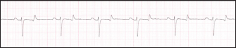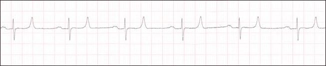 Fig. 2. ECG tracing recorded in a clinically healthy Chianina cow. Positive and “bifid” P waves, QRS complexes with “RS” configuration, and positive T waves are evident in the electrocardiogram. HR is 60 bpm. Paper speed=25 mm/second; gain=10 mm/mV.