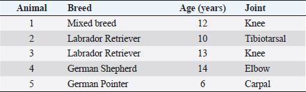 After therapy, the animals did not reveal any clinical improvement and, during a 6-months period, they had not undergone any pharmacological or physical rehabilitation procedures. PRP therapyThe osteoarthritic joints of the five studied animals were targeted for allogeneic PRP therapy. The PRP gel was provided by Vetherapy (Coimbra, Portugal). In order to obtain PRP, venous blood was collected in a 250-ml transfusion bag with citrate phosphate dextrose. The blood samples were sent to the laboratory and were analyzed to make sure animals were vaccinated. Within 12 hours, the blood samples were processed under Vetherapy’s proprietary protocol by the dual centrifugation technique (one low-speed and one high-speed centrifugation) with the standardization of platelet counts per ml (minimum of 1 million platelets per microliter). The obtained PRP was pooled together, stored and frozen, and sent to Arrábida Veterinary Hospital in 1.5-ml vials on dry ice. In all the dogs from which blood was obtained using an allogeneic approach, echoguided intraarticular PRP injection was administered under sedation with a combination of 0.2 mg/kg of midazolam, 0.2 mg/kg of methadone, and 0.6 mg/kg of propofol, intravenously and after aseptic field preparation (Fig. 2). After this procedure, the animals were evaluated after 30, 60, and 90 days. Statistical analysisThe data obtained were subject to descriptive statistical analysis that included the calculation of absolute and relative frequencies, means, and standard deviation using the Microsoft Office Excel 2013 software (Microsoft, United States of America). Ethical approvalThere were no ethical issues to address. ResultsIt can be seen that all animals improved after 90 days of treatment. In this scenario, two clinical parameters were evaluated: the grade of lameness on days 0, 30, 60, and 90 (Table 2) and the score of pain on days 0, 30, 60, and 90 (Table 3). All animals showed a decrease in lameness grade after 90 days. Animal 2, after day 90, presented a normal gait. The two animals with grade III lameness, after 90 days of PRP administration, improved for grades I and II, respectively. The two animals that presented grade II lameness evolved to grade 0, i.e., without lameness. The only animal with grade IV lameness, after PRP application decreased to a grade II. For pain evaluation, there were positive results, with the first three animals becoming painless, while animals 4 and 5 went from having severe and moderate pain to mild pain after day 90, respectively.