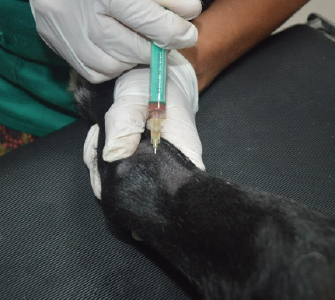 Fig. 2. Intraarticular injection of PRP after echoguided localization of the articular cavity. In this work, our study population comprised mainly adult to geriatric large breed dogs (Labrador Retriever, German Shepherd, and German Pointer), described as predisposed to the development of OA (Bland, 2015). The clinical results obtained were promising because PRP administration was well tolerated by these types of patients and clinical improvement was documented. These results are in agreement with the published scientific literature. A recent study on dogs showed promising results on the management of OA caused by cruciate ligament rupture using minimal leukocyte PRP. The studied population demonstrated an increase in many different gait associated parameters, such as peak vertical forces, angular range of motion, and stance time without associated side effects (Vilar et al., 2018). Studies on horses have shown that intralesional treatment of PRP promoted resolution of tendinitis associated with decreased lameness, edema, local sensitivity, as well as improved ultrasound image of evaluated structures (Carmona et al., 2007). Abellanet and Prades (2009) studied 42 sport horses with OA lesions, wherein 70% of horses receiving PRP therapy resumed their normal work routine and only 9.5% of the animals relapsed when compared to the control group, wherein 33% of the horses relapsed. In the latter two studies, no local or systemic side effects were reported following PRP treatment (Carmona et al., 2007; Abellanet and Prades, 2009). Table 2. Lameness grades at day 0 and at days 30, 60, and 90 after PRP administration.