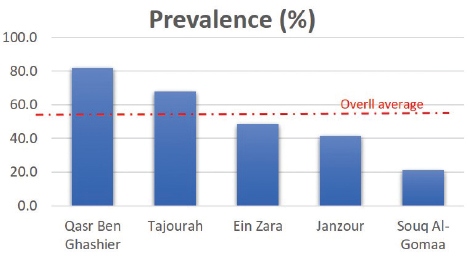Fig. 2. The prevalence of NDV antibodies using ELISA in backyard chickens in different locations of Tripoli during summer and winter. Among different locations, the prevalence of NDV infections was higher in Qasr Ben Ghashier (about 92%) in summer and winter compared with other locations. The result of ELISA test for sera collected from Qasr Ben Ghashier was also the highest (82%), which was statistically significant as compared with other regions (X2=74.09, p ≥ 0.00001). In Tripoli, many locations are well known for their heavy density of commercial poultry farms as well as backyard poultry rearing. Most of commercial poultry farms in Tripoli are located in Qasr Ben-Ghashier, Tajourah and Al-sawany. More than thirty commercial and backyard poultry farms are found in a total area of 9 km2 in Qasr Ben-Ghashier. The uncontrolled rearing of backyard poultry has resulted in disastrous spread of viral diseases in many countries throughout the world (WHO/OIE/FAO, 2009). Samples collected from Janzour, Souq Al-Gomaa, and Ein Zara in summer and winter were negative for NDV by rRT-PCR. However, sera collected from those locations and tested by ELISA were positive. Out of 412 serum samples screened in this study by ELISA, 218 were positive representing 53%. These results indicate that NDV specific antibodies were detected among backyard chickens. Backyard poultry are not vaccinated against ND, the presence of NDV antibodies in their sera would be as a result of natural infection with the virus. In addition, higher antibody titers of NDV in birds are likely due to natural infection which is known to be higher than antibodies titers that result from vaccination. In spite of vigorous vaccination schedules, ND is still a threat to the poultry industry in developing countries (Luc et al., 1992). In Libya, vaccination could be as an effective method of controlling ND in commercial poultry, however, the veterinary services do not implement any vaccination program for backyard poultry. Moreover, the use of poultry manure collected from commercial poultry farms as a natural fertilizer without previous heat treatment/suitable air drying can represent a potential source of the virus. Inter-state trade of poultry and poultry products is also a common feature, especially on known market days (Awan et al., 1994). ConclusionIn conclusion, it is worthy to mention that the rare data about backyard poultry rearing as well as their diseases has resulted in a lack of awareness about the epidemiological pattern of ND among Libyan indoor poultry populations. This study demonstrated the situation of ND in backyard chicken as a source of infection highlighting the necessity of a comprehensive vaccination plan for backyard chickens. AcknowledgmentsThe authors would like to thank the laboratory personnel of the National Center of Animal Health for the help and support. Conflicts of interestThe authors declare that they have no competing interests. Authors’ contributionsEAG, HAA, SOA and IME have designed the study. ASD did the statistical analysis. All authors have written, revised and approve the manuscript. ReferencesAbd El Aziz, M.N., Abd El-Hamid, H.S., Ellkany, H.F., Nasef, S.A., Nasr, S.M. and El-Bestawy, A.R. 2016. Biological and molecular characterization of newcastle disease virus circulating in chicken Flocks, Egypt, during 2014-2015. Zagazig Vet. J. 44(1), 9–20. Alexander, D.J. 1997. Newcastle disease and other paramyxorius infections. In Diseases of poultry, 10th ed. Eds., Calnek, B.W., Barnes H.J., Beard C.W., Reid, W.M. and Jorder H.W. Ames, IA: Iowa State University Press, pp: 541–569. Alexander, D.J. and Senne, D.A. 2008. Newcastle disease, other avian paramyxoviruses, and pneumovirus infections. In Diseases of poultry, 12th ed. Eds., Saif, Y.M., Fadly, A.M., Glisson, J.R., McDougald, L.R., Nolan, L.K. and Swayne, D.E. Ames, IA: Iowa State University Press, pp: 75–100. Al-Garib, O.S., Kammon, A., Asheg, A., Hamid, M., Fathlla, H. and Lawal, A. 2007. Detection of antibodies to avian influenza H9N2 in broiler flocks clinically expressing a respiratory disease syndrome. In Proceeding of the 15th Congress & Exhibition of the World Veterinary Poultry Association. Beijing, China. Al-Garib, S.O., Asheg, A.A., Kammon, A. and Hamid, M.A. 2006. An outbreak of a respiratory infection of multi-agents occurred in poultry flocks in Tripoli, Libya. In EPC 2006-12th European Poultry Conference, 2006 Sep 10–14, Verona, Italy, World’s Poultry Science Association (WPSA). Awan, M.A., Otte, M.J. and James, A.D. 1994. The epidemiology of Newcastle disease in rural poultry: A review. Avian Pathol. 23(3), 405–423. Berghiche, A., Khenenou, T., Kouzi, A. and Labiad, I. 2018. An investigation on the predominant diseases, its diagnosis, and commonly used drugs in the poultry farms in the NorthEastern regions of Algeria. Vet. World 11(7), 986–989. Capua, I. and Alexander, D.J. 2006. The challenge of avian influenza to the veterinary community. Avian Pathol. 35(3), 189–205. Cattoli, G., De Battisti, C., Marciano, S., Ormelli, S., Monne, I., Terregino, C. and Capua, I. 2009. False-negative results of a validated real-time PCR protocol for diagnosis of Newcastle disease due to genetic variability of the matrix gene. J. Clin. Microbiol. 47(11), 3791–3792. Dhama, K., Mahendran, M. and Tomar, S. 2008. Pathogens transmitted by migratory birds: Threat perceptions to poultry health and production. Int. J. Poult. Sci. 7(6), 516–525. Doyle, T.M. 1927. A hitherto unrecorded disease of fowls due to a filter-passing virus. J. Comp. Pathol. Ther. 40(2), 144–169. Essghaier, M.F.A., Etayeb, K.S., Bourass, E. and Prashant, J.J. 2013. Status and distribution of coastal birds at Farwa Island, Libya. Travaux de l’Institut Scientifique, Rabat, Série Zoologie 49(1), 79–85. Hahn, S., Bauer, S. and Liechti, F. 2009. The natural link between Europe and Africa: 2.1 Billion Birds on Migration. OIKOS. 118(4), 624–626. Hill, N.J., M