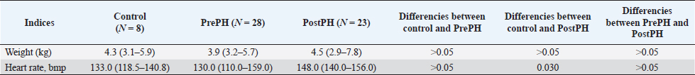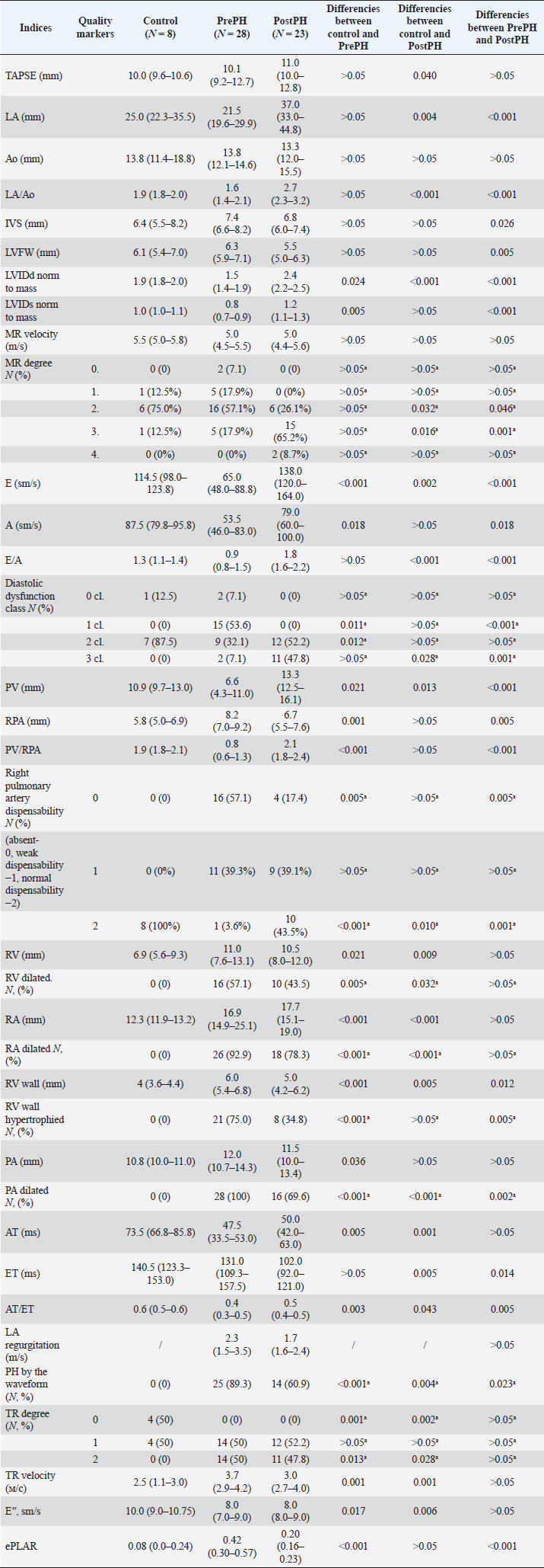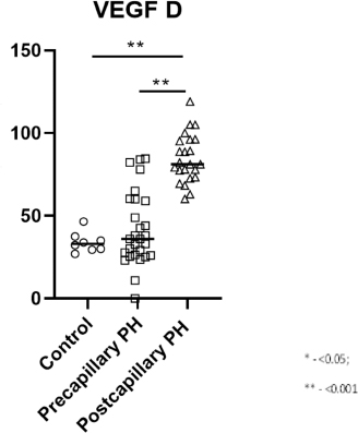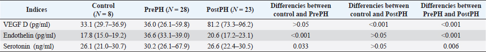 Fig. 1. Graphic representation of the VEGF-D plasma concentration in PrePH, PostPH, and control groups. Plasma markers showed correlation to EchoCG findings, analyzed by Spearman Heatmap. We observed reverse correlation between VEGF-D and LVFW for PrePH dogs (r=−0.53, p=0.004), ET-1 and PA effusion time (r=−0.50, p=0.006); positive correlation for serotonin and presence of PA regurgitation (r=0.60, p=0.035). In Post PH group, we found reverse correlation of these serotonin (r=−0.59, p=0.003) and VEGF-D (r=−0.62, p=0.002) to the IVS width; reverse correlation of ET-1 and MR (r=−0.51, p=0.012); positive correlation of the serotonin concentration and PA acceleration time (r=0.58, p=0.004). DiscussionIn this study, we tried to find a correlation between EchoCG parameters and serum biomarkers in PH forms differentiation. We suspect that our findings in biomarkers could help with PH diagnosis in cases where EchoCG should be avoided or is unavailable. There is a tendency in human medicine to replace or find alternative circulating biomarkers to avoid invasive methods. In the context of this study, which includes dogs with previously diagnosed LSHF, we could not use natriuretic peptides due to possible difficulties in the interpretation.