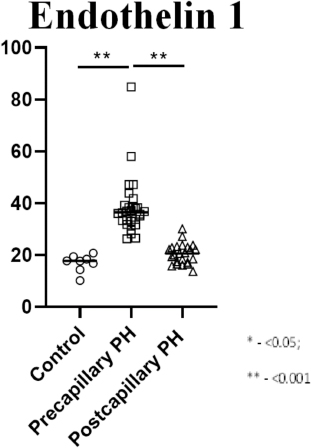 Fig. 2. Graphic representation of the ET-1 plasma concentration in PrePH, PostPH, and control groups. The pathogenies of chronic pulmonary congestion predispose to compensatory increased volume drainage, which is done by the lymphatic system. Physiological dog studies discovered that lymph drainage could be enhanced above 300% in case of chronic volume overload (Uhley et al., 1962). VEGF-D is a predominantly lymphatic vessels growth factor, taking part in lymphatic pool remodeling both in chronic interstitial lung diseases and LSHF (Achen et al., 1998). Human clinical studies found that patients with dyspnea and later diagnosed heart failure had elevated plasma VEGF-D concentration. Authors suspected that this condition/symptom developed as a consequence of pulmonary circulation congestion and compensatory lymphatic system remodeling. This could also be associated with PostPH development due to pulmonary arterial wedge pressure (PAWP) increase and alteration in the microcirculatory drainage (Borné et al., 2018). This statement was validated by the study which showed a correlation between PAWP and VEGF-D (Houston et al., 2019). Additionally, VEGF-D rise was admitted in cases of chronic PAT, which was interpreted as a remodeling due to local congestion in the context of the redistributive edema (Säleby et al., 2019). In both cases, VEGF-D was associated with increased pulmonary vascular resistance, vessels remodeling due to chronic congestion. Moreover, VEGF-D is a mortality factor for patients with PostPH (Miller et al., 2013). One more interesting study in terminal heart failure and cardiac transplantation showed lowering of VEGF-D levels due to a decrease in signs of pulmonary congestion and pulmonary vascular resistance (Ahmed et al., 2020).