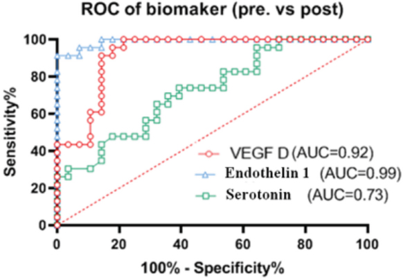 Fig. 4. Grafical ROC with diagnostic ability of the blood markers. Our VEGF-D observations in this study showed that in dogs with EchoCG diagnosed PostPH, VEGF-D concentration almost doubled. This result is similar to a prospective study in human medicine, which elucidates the correlation between PAWP and VEGF-D (Houston et al., 2019). Based on the physiological features of lymphatic drainage in cases of chronic volume overload described in early physiological studies, we suspected these changes are mostly attributed to lymphatics proliferation to prevent pulmonary congestion in dogs with myxomatous valvular disease (Uhley et al., 1962). Logically we can predict a correlation between LA pressure, PAWP and blood VEGF-D concentration. As for ET-1, it was significantly higher in dogs with PrePH, than in the PostPH and control groups. This factor could be explained by microvascular bed remodeling both in the late stages of LSHF and secondary pulmonary arterial remodeling due to lung interstitial disease or pneumonitis. In this context, we can suspect a correlation between ET-1 and right-sided heart failure, because in human studies we can find data about the dependence between ET-1 level and right atrial pressure, and pulmonary artery oxygen saturation (Nootens et al., 1995). Moreover, a recent veterinary study found that dogs with PrePH have a median lifespan of about 276 days, while PostPH dogs—576 days, which shows us possible benefits in diagnosis, monitoring and treatment of the found PH (Borgarelli et al., 2015; Jaffey et al., 2019). In conclusion, we can say, that the most valuable circulating marker in this study is ET-1. It rose in both Post- and PrePH, which reflects its own diagnostic power of the PH diffentiation. But in combination with VEGF-D, it could show the difference between the forms. Subjectively we can recommend these markers as diagnostic criteria of PH in absence of echocardiography, and prediction of the right heart or the left heart failure phenotype. In this study, several limitations are present. We lack the opportunity to differentiate some specific diseases such as hemangiomatosis or veno-occlusive disease, which could be presented with similar symptoms, observed in this study’s dogs, and could show EcoCG signs of both Pre- and PostPH or shifting between phenotypes (Reinero et al., 2019). But our findings are pointing at the leading wing of the pulmonary microcirculation bed damage. Additionally, we studied acute manifestations, predisposing to speculations in chronic states interpretations or comorbidities. Of course, this study should be powered by more wide prospective study, including more dogs and re-analyzing time and treatment interactions. And we have to find out the specific circulatory and respiratory systems threshold. AcknowledgmentSpecial thanks to Toropova J.V., Zelinskaya I.V. for providing an opportunity to analyze studied substrates. Author’s contributionOleynikov D.: collected data, provided diagnostics and treatment, coordinated the data-analysis and contributed to the writing of the manuscript. Ma Yi: coordinated the data analysis and contributed to the writing of the manuscript. ReferencesAchen, M., Jeltsch, M., Kukk, E., Mäkinen, T., Vitali, A., Wilks, A., Alitalo, K. and Stacker, S. 1998. Vascular endothelial growth factor D (VEGF-D) is a ligand for the tyrosine kinases VEGF receptor 2 (Flk1) and VEGF receptor 3 (Flt4). Proc. Natl. Acad. Sci. USA. 95(2), 548–553. Ahmed, S., Ahmed, A., Säleby, J., Bouzina, H., Lundgren, J. and Rådegran, G. 2020. Elevated plasma tyrosine kinases VEGF-D and HER4 in heart failure patients decrease after heart transplantation in association with improved haemodynamics. Heart Vessels 35(6), 786–799. Borgarelli, M., Abbott, J., Braz-Ruivo, L., Chiavegato, D., Crosara, S., Lamb, K., Ljungvall, I., Poggi, M., Santilli, R. and Haggstrom, J. 2015. Prevalence and prognostic importance of pulmonary hypertension in dogs with myxomatous mitral valve disease. J. Vet. Intern. Med. 29, 569–574. Borné, Y., Gränsbo, K., Nilsson, J., Melander, O., Orho-Melander, M., Smith, J. and Engström, G. 2018. Vascular endothelial growth factor D, pulmonary congestion, and incidence of heart failure. J. Am. Coll. Cardiol. 71, 580–582. Campbell, F. 2007. Cardiac effects of pulmonary disease. Vet. Clin. North Am. Small Anim. Pract. 37(5), 949–962. Channick, R., Simonneau, G. and Sitbon, O. 2001. Effects of the dual endothelin-receptor antagonist bosentan in patients with pulmonary hypertension: a randomised placebo-controlled study. Lancet 358, 1119–1123. Cody, R., Haas, G., Binkley, P., Capers, Q. and Kelley, R. 1992. Plasma endothelin correlates with the extent of pulmonary hypertension in patients with chronic congestive heart failure. Circ. 85, 504–509. Dupuis, J. and Hoeper, M. 2008. Endothelin receptor antagonists in pulmonary arterial hypertension. Eur. Respir. J. 31, 407–415. Eddahibi, S., Hanoun, N., Lanfumey, L., Lesch, K., Raffestin, B. and Hamon, M. 2000. Attenuated hypoxic pulmonary hypertension in mice lacking the 5-hydroxytryptamine transporter gene. J. Clin. Invest. 105, 1555–1562. Eickelberg, O., Yeager, M. and Grimminger, F. 2003.The tantalizing triplet of pulmonary hypertension BMP receptors, serotonin receptors and angiopoietins. Circ .Res. 60, 465–467. Hashimoto, Y., Hirota, K., Yoshioka, H., Hashiba, E., Kudo, T. and Ishihara, H. 2000. Spasmolytic effects of prostaglandin E1 on serotonin-induced bronchoconstriction and pulmonary hypertension in dogs. Br. J. Anaesth. 85, 460–462. Heishima, Y., Hori, Y., Nakamura, K., Yamashita, Y., Isayama, N., Kanno, N., Katagi, M., Onodera, H., Yamano, S. and Aramaki, Y. 2018. Diagnostic accuracy of plasma atrial natriuretic peptide concentrations in cats with and without cardiomyopathies. J. Vet. Cardiol. 20(4), 234–243. Hewes, J., Lee, J., Fagan, K. and Bauer, N. 2020. The changing face of pulmonary hypertension diagnosis: a historical perspective