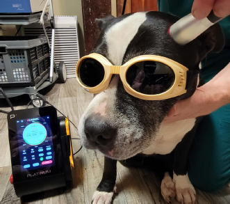 Fig. 3. Application of tPBMT to a dog using a class 4 laser. This class of laser should be used only by trained veterinary personnel.