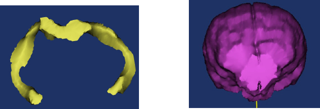 Fig. 1. Examples of hippocampal volume (A) and total brain volume (B) procurement from MR images using Mimics® software. Dogs with CCD had smaller normalized hippocampal volumes than control dogs (median 6.2 vs. 7.9; p=0.04; Fig. 3). Limits of agreement analysis showed repeat measurements to agree with original measurements within a 30% range. DiscussionOur study demonstrates that dogs afflicted with CCD have smaller hippocampal volumes compared to similarly aged control dogs without CCD. The differences were small, and showed a substantial degree of overlap between the two groups, suggesting that hippocampal volumetric measurements in dogs will be unable to discriminate between healthy and CCD dogs on an individual basis. However, our data suggest that hippocampal atrophy is not part of canine aging, as we could find no clear association between age and hippocampal volumes in either group. Hippocampal atrophy is a key and early feature of human AD, and loss of hippocampal neurons and synapses is strongly associated with cognitive decline in that disorder (Wang et al., 2015; Halliday, 2017; Ferrari et al., 2019). Hippocampal pathology has been documented in brains of dogs with CCD, but hippocampal atrophy has not been demonstrated for this disorder (Schmidt et al., 2015). In addition to hippocampal atrophy being a central pathophysiologic aspect of AD, the hippocampus is a source of neuronal stem and progenitor cells. Research into the roles of the hippocampus in AD pathogenesis and potential methods of positively affecting hippocampal function to treat AD patients is ongoing (Kirschen and Ge, 2019). CCD is considered a naturally occurring canine analogue of human AD (Hasegawa et al., 2005; Schmidt et al., 2015; Schutt et al., 2015; Chapagain et al., 2018; Dewey et al., 2019). Hippocampal-directed research in CCD patients may potentially benefit dogs with that disorder and human AD patients.