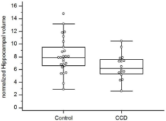 Fig. 3. Box and whisker plots comparing normalized hippocampal volumes between aging control dogs and dogs with CCD. Future MRI investigations into hippocampal atrophy in dogs with CCD would benefit from prospective investigations with larger case numbers, more closely age-matched controls, more consistent imaging procurement (i.e., one machine model), and more structurally detailed images (e.g., diffusion tensor imaging and tractography). Additionally, comparison of linear MRI measurements of hippocampal volumes between CCD patients and successfully aging dogs should be performed. Hopefully, investigations into hippocampal-related aspects of AD will benefit from CCD dogs as a disease model. In conclusion, we demonstrated that dogs with CCD have significantly smaller total hippocampal volumes, as measured on MR images, compared with successfully aging controls. This finding may have implications in pathophysiologic and therapeutic research into hippocampal-associated aspects of CCD and AD. Conflict of interestThe authors declare that there is no conflict of interest. Authors’ contributionsDrs. Dewey, Rishniw, and Platt were involved with the study inception and design. Dr. Rishniw performed statistical analyses. Dr. Johnson was involved in image analysis and study design. Dr. Robinson was involved in case material acquisition and manuscript preparation. Mr. Sackman and Ms. O’Donnell were involved in case material acquisition and volumetric measurements. All authors were involved in manuscript preparation. ReferencesBayram, E., Caldwell, J.Z.K. and Banks, S.J. 2018. Current understanding of magnetic resonance imaging biomarkers and memory in Alzheimer’s disease. Alzheimers Dement. 4, 395–413. Bland, J.M. and Altman, D.G. 1999. Measuring agreement in method comparison studies. Stat. Methods Med. Res. 8, 136–160. Chapagain, D., Range, F., Huber, L. and Virányi, Z. 2018. Cognitive aging in dogs. Gerontology 64, 165–171. Dewey, C.W., Davies, E.S., Xie, H. and Wakshlag, J.J. 2019. Canine cognitive dysfunction: pathophysiology, diagnosis and treatment. Vet. Clin. North Am. Small. Anim. Pract. 49(3), 477–499. Dhikav, V., Duraiswamy, S. and Anand, K.S. 2017. Correlation between hippocampal volumes and medial temporal lobe atrophy in patients with Alzheimer’s disease. Ann. Indian Acad. Neurol. 20, 29–35. Estey, C.M., Dewey, C.W., Rishniw, M., Lin, D.M., Bouma, J., Sackman, J. and Burkland, E. 2017. A subset of dogs with presumptive idiopathic epilepsy show hippocampal asymmetry: a volumetric comparison with non-epileptic dogs using MRI. Front. Vet. Sci. 4, 183; doi:10.3389/fvets.2017.00183 Ferrari, B.L., Campos Neto, G., Nucci, M.P., Mamani, J.B., Lacerda, S.S., Felício, A.C., Amaro, E. and Gamarra, L.F. 2019. The accuracy of hippocampal volumetry and glucose metabolism for the diagnosis of patients with suspected Alzheimer’s disease, using automatic quantitative clinical tools. Medicine (Baltimore) 98(45), e17824; doi: 10.1097/MD.0000000000017824 Gardini, A., Taeymans, O., Cherubini, G.B., de Stefani, A., Targett, M. and Vettorato, E. 2019. Linear magnetic resonance imaging measurements of the hippocampal formation differ in young versus old dogs. Vet. Rec. 185(10), 306. Halliday, G. 2017. Pathology and hippocampal atrophy in Alzheimer’s disease. Lancet Neurol. 16(11), 862–864. Hasegawa, D., Yayoshi, N., Fujita, Y. and Orima, H. 2005. Measurement of interthalamic adhesion thickness as a criteria for brain atrophy in dogs with and without cognitive dysfunction (dementia). Vet. Radiol. Ultrasound 46, 452–457. Kirschen, G.W. and Ge, S. 2019. Young at heart: insights into hippocampal neurogenesis in the aged brain. Behav. Brain Res. 369, 111934; doi: 10.1016/j.bbr.2019.111934. Leigh, E.J., Mackillop, E., Robertson, I.D. and Hudson, L.C. 2008. Clinical anatomy of the canine brain using magnetic resonance imaging. Vet. Radiol. Ultrasound 49, 113–121. Milne, M.E., Anderson, G.A., Chow, K.E., O’Brien, T.J., Moffat, B.A. and Long, S.N. 2013. Description of technique and lower reference limit for magnetic resonance imaging of hippocampal volumetry in dogs. Am. J. Vet. Res. 74, 224–231. Schmidt, F., Boltze, J., Jager, C., Hofmann, S., Willems, N., Seeger, J., Härtig, W. and Stolzing, A. 2015. Detection and quantification of ß-amyloid, pyroglutamyl Aß, and tau in aged canines. J. Neuropath. Exp. Neurol. 74, 912–923. Schroder, J. and Pantel, J. 2016. Neuroimaging of hippocampal atrophy in early recognition of Alzheimer’s disease-a critical appraisal after two decades of research. Psychiatry Res. Neuroimaging 247, 71–78. Schutt, T., Toft, N. and Berendt, M. 2015. Cognitive dysfunction, progression of age-related behavioral changes, biomarkers, and survival in dogs more than 8 years old. J. Vet. Intern. Med. 29, 1569–1577. Tapp, P.D., Siwak, C.T., Gao, F.Q., Chiou, J.-Y., Black, S.E., Head, E., Muggenburg, B.A., Cotman, C.W., Milgram, N.W. and Su, M-Y. 2004. Frontal lobe volume, function, and ß-amyloid pathology in a canine model of aging. J. Neurosci. 24, 8205–8213. Wang, L., Benzinger, T.L., Hassenstab, J., Blazey, T., Owen, C., Liu, J., Fagan, A.M., Morris, J.C. and Ances, B.M. 2015. Spatially distinct atrophy is linked to ß-amyloid and tau in preclinical Alzheimer disease. Neurology. 85, 1254–1260. | ||